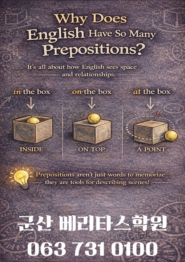 영어를 배우는 학생들이 가장 많이 하는 말이 있습니다. “전치사는 왜 이렇게 많아요?” “in이랑 on이랑 at은 도대체 뭐가 달라요?” 많은 학생들이 전치사를 ‘암기 지옥’이라고 느낍니다. 하지만 전치사는 외워야 할 목록이 아니라, 영어가 공간을 바라보는 방식입니다. Ⅰ. 영어는 ‘위치’를 굉장히 정확하게 구분하는 언어입니다 예를 들어 볼까요? in the box on the box at the box 한국어로는 모두 “상자에”라고 번역될 수 있습니다. 하지만 영어에서는 공간의 관계가 다릅니다. in → 안쪽에 들어가 있음 on → 표면에 닿아 있음 at → 한 점, 위치 지점 전치사는 단어가 아니라 장면을 설명하는 도구입니다. Ⅱ. 그래서 직역....... <img src="https://blogthumb.pstatic.net/MjAyNjAyMjNfMTM3/MDAxNzcxODI5MzIyMTgw.CAgIoUKFLQCRlCXw8sJ5OwyDcPjAMND7GF88x2qnflcg.qrkYsk9Ekk_5jz79hQqVVP9xzzpeT6RtwXIXwnNA2DQg.JPEG/%C1%A6%B8%F1%C0%BB_%C0%D4%B7%C2%C7%D8%C1%D6%BC%BC%BF%E4._%281%29.jpg?type=s3" />