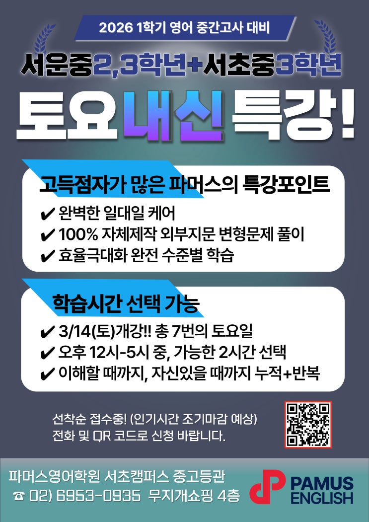 [서운중2,3&서초중3 내신대비 토요특강] 외부지문 완벽대비! 2026 1학기 내신도 파머스 서초! 결과가 증명하는 학원 - 서운중영어내신, 서초중영어내신, 서운중영어학원