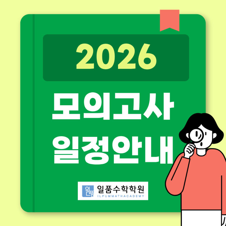안녕하세요. 화명동 일품수학 학원입니다. 오늘은 2026년 모의고사 일정에 대해 알려드리겠습니다. ^^ 고등학생 모의고사 종류 정리 ① 교육청 모의고사 주관 : 시,도 교육청 대상 : 고1, 고2, 고3 특징 : 난이도는 평가원보다 다소 쉬움 내신대비 + 전국 단위 실력 점검용 ② 평가원 모의고사 (6월, 9월) 주관 : 한국교육과정평가원 대상 : 고3 특징 : 수능 출제 기관이 직접 출제 (수능과 가장 유사) 수시 지원 전략 수립의 핵심 자료 학년별 모의고사 시행 횟수 고1 : 3월, 6월, 9월, 10월 (총 4회) 고2 :3월, 6월, 9월, 10월 (총 4회) 고3 : 3월, 6월, 7월, 9월, 10월 + 수능 (총 7회) 2026년 모의고사 전체 일정 한눈에 보기 모의고사 대비....... <img src="https://blogthumb.pstatic.net/MjAyNjAzMTBfODUg/MDAxNzczMTI1NjY5NjYx.3lVztyidwwqV1KjYmgOA9ySMFWXsw6CoUT28aFQUOLcg.iNQEuz9aJiNyuKKA-JZjPHzlUo8SjwwmijcYLaLStskg.PNG/%C1%A6%B8%F1%C0%BB_%C0%D4%B7%C2%C7%D8%C1%D6%BC%BC%BF%E4._%283%29.png?type=s3" />