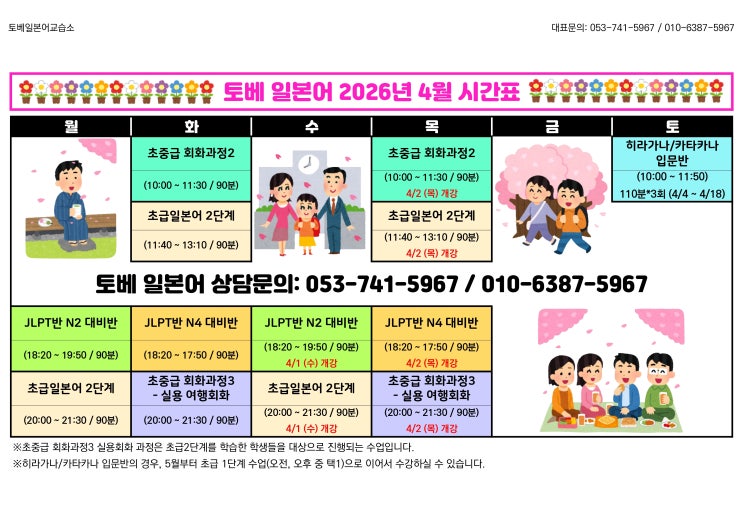 (이미지를 클릭하시면, 큰 이미지로 보실 수 있습니다.) 안녕하세요 토베일본어교습소입니다. 곧 개강할 수업을 안내해 드립니다. [초급일본어 / 초중급 과정 수업] <주말 오전 수업> 히라가나 카타카나 입문반 (주1회 110분 수업, 8만원) - 4/4,4/11,4/18 3회 진행 토 오전 10시 00분 ~ 오전 11시 50분 (110분 수업 / 1개월 과정) 일본어의 글자인 히라가나와 카타카나를 천천히 공부하는 수업입니다. 일본어학습이 완전 처음이신 분, 글자를 다시 공부하고 싶은 분들께 추천드립니다. (사용 교재: 히라가나 가타카나 쓰기노트 (동양북스)) - 4/4(토) 개강 <오전 수업> 초중급 회화과정 2 (주2회 90분수업, 15만원) 화, 목 오전 10시....... <img src="https://blogthumb.pstatic.net/MjAyNjAzMTdfMTU5/MDAxNzczNzI3NDYzMTIx.9G-2g4OAxWD0q6l9Ig4dd9Stnhd-srTNchcULGh1adAg.t_3mA8ewt0-AzHmyCUm_BkH8rVnxzhttMjY_4i_mrQsg.JPEG/202604_%BD%C3%B0%A3%C7%A5_-_web%BF%EB_page-0001.jpg?type=s3" />