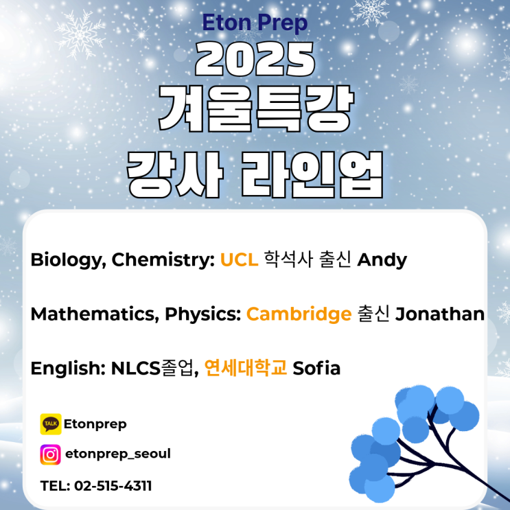 안녕하세요, 이튼 프렙입니다! 날씨가 점점 더 추워지고 있는데 모두 감기 조심하셔서 추운 겨울 따뜻하게 보내시길 바랍니다 :) 이번 포스팅은 많은 분들께 좋은 정보가 될만한 겨울특강 강사 라인업입니다! 이번 특강에는 정말 실력 있으신 강사님들만 모았으니 기대해 주셔도 좋을 것 같습니다 :) 먼저 저희 원장 선생님이신, Andy Yi 선생님입니다. 전임 과목: Biology, Chemistry (IB, A-Level, MYP, IGCSE) 학력 Abingdon School (UK) 졸업 BSc Biochemistry, University College London (UCL, UK) MSc Biochemical Engineering, University College London (UCL, UK) 원장 선생님은 초, 중, 고등학교를 모두 영국에서 졸업하고 대학교 학....... <img src="https://blogthumb.pstatic.net/MjAyNTExMjdfMTcg/MDAxNzY0MjQwODI0NzAw.FGhFWZc2rCYsx-0KBjRHW4FSPJZcIhUvPV08Yy2gJPUg.lrGHcnbj2HHDAML2H8q2fdl8f7RCxO0V5cxf5BUTHkEg.PNG/2025_%B0%DC%BF%EF%C6%AF%B0%AD_%B0%AD%BB%E7_%B6%F3%C0%CE%BE%F7.png?type=s3" />
