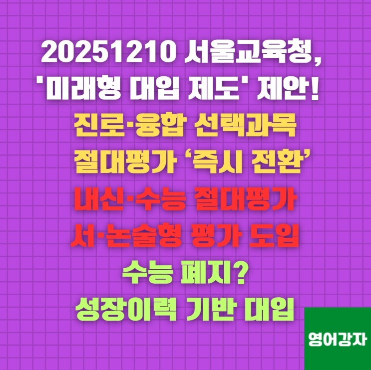 이번 내용은 **확정 정책이 아닌 ‘제안’**이므로, 해석과 적용에 있어 주의하여 읽어주시면 좋겠습니다. 진로 융합 선택과목 절대평가로 즉시 전환 내신 및 수능 절대평가 전환, 수능 서*논술형 평가 도입 수능 폐지, 학생 성장 이력 중심 대입 지원 체계 정착 입시제도의 본질은 제도가 어떻게 바뀌더라도 결국 **‘평가와 선발’**이라는 요소 때문에 경쟁을 피할 수 없다는 점에 있습니다. 지금까지의 입시 역사가 말해주듯, 입시는 결코 쉬워지지 않고, 오히려 진화할수록 더 어려워지는 구조를 갖고 있습니다. 서·논술형 평가 역시 충분한 input이 있어야 output이 가능한 방식이므로 현행 기조에 더해 출력 능력까지 요구되는 구조가 될....... <img src="https://blogthumb.pstatic.net/MjAyNTEyMTBfNjQg/MDAxNzY1MzU3OTMxNDA2.gKvJiYNQSbsVyKr4TGa24Xq4m8Sd8hcs2HD9J5__pGMg.Igw0WaO0zaBRaRW80sRcp5SIfA1u6bkUVxANCZT6eW4g.JPEG/%3F%8D%B8%3F%84%A4%3F%9D%BC.jpg?type=s3" />