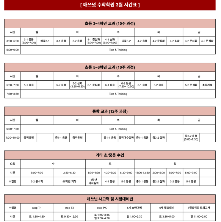 [2026] 매쓰넛 수학학원 3월 시간표 안내