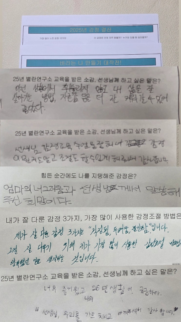2025 감정결산 별란연구소, 한 해의 수업을 마무리하며 2025년 감정결산 수업으로 올해의 별란연구소 수업을 차분히 마무리했습니다. 아이들이 가장 즐거워했던 시간은 역시 또래와의 교감, 함께 어울리는 놀이와 활동의 순간이었습니다. 함께 웃고, 부딪히고, 조율하며 서로의 마음을 알아가는 그 시간이 아이들에게는 가장 살아 있는 배움의 시간이었습니다. 아이들의 가장 큰 자원은 ‘가족’이었습니다 감정결산 과정에서 드러난 아이들의 가장 강력한 자원은 가족이었습니다. 힘들 때 떠올리는 존재, 다시 회복할 수 있게 하는 기반, 그리고 “나는 괜찮은 사람”이라는 감각의 출발점. 역시 가족의 힘은 가장 단단한 토대였습니다. 아이들....... <img src="https://blogthumb.pstatic.net/MjAyNjAxMDRfMzkg/MDAxNzY3NDkwNjU1NTg2.A4a7WxCJf-VEu3Lb6ejKp5AbwBOs7oHe9Hg7YQ4VUmQg.vpPB1bfpWm9S5tcXtkOpMtiL5GCzbWtT9acNkMCbTw4g.JPEG/%B0%A8%C1%A4%B1%B3%C0%B0%2C%BA%B0%B6%F5%BF%AC%B1%B8%BC%D2%B0%A8%C1%A4%B1%B3%C0%B0%C7%D0%BF%F8%2C%BB%E7%C8%B8%C1%A4%BC%AD%C7%D0%BD%C0%2C%BB%E7%C8%B8%BC%BA%B1%B3%C0%B0%2C%C1%A4%BC%AD%B1%B3%C0%B0%2C%B0%FC%B0%E8%B1%B3%C0%B0%2C%B8%B6%C0%BD%C3%AC%B1%E8%B1%B3%C0%B0%2C%BE%EE%B8%B0%C0%CC%B8%ED%BB%F3%2C%BA%B0%B6%F5%BF%AC%B1%B8%BC%D2%2C%BB%E7%C8%B8%BC%BA%B1%D7%B7%EC.jpg?type=s3" />
