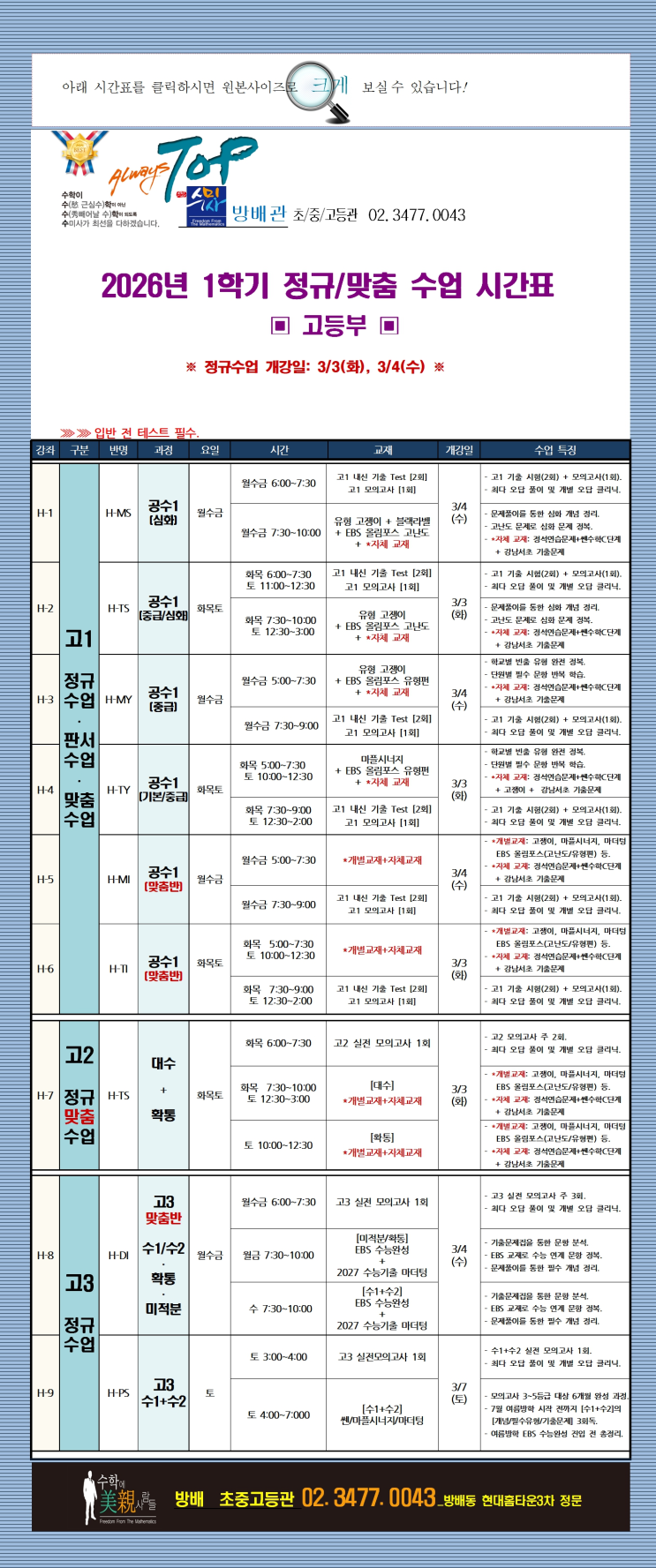 [방배 고등관]2026.1학기 시간표 안내