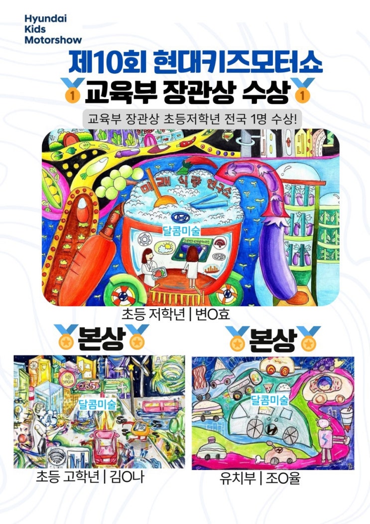 두근두근 현대키즈모터쇼 수상자 발표 결과가 나왔어요! 세상에!!! 달콤미술학원에서 교육부 장관상을 수상했어요! 수상자 1명 나오기도 어려운 대회라서 상을 받을 수 있을까 싶었는데 우수심사작에 오른것만으로도 영광이었는데 그중 각 부분 1명 받을 수 있는 #교육부장관상 을 우리 달콤친구가 받게되었어요!^^ 한달동안 매일매일 틈날때마다 나와서 학원문닫을때까지 작품그려내더니 그 노력이 이렇게 큰 상으로 돌아온것 같아요 이렇게 멋진 심사평을 남겨주신 심사위원님께도 감사합니다 그리고 본상도 2명이나 수상!! 새해부터 상복터진 달콤미술!^^ 너무너무 축하해 우리 달콤이들❤️ 교육부 장관상 받으러 서울가자!^^ 현대키....... <img src="https://blogthumb.pstatic.net/MjAyNjAyMjBfMTk3/MDAxNzcxNTU2ODI1MTI1.3xBhZNW0TrUOA47cQFkhoL89VTAPl7LF6z1MyBe_Duog.-YJoaC0f4Jw6flNt2rpuZHEzFsZ7xJodLwj28gAscVEg.JPEG/output%A3%DF1332755898.jpg?type=s3" />