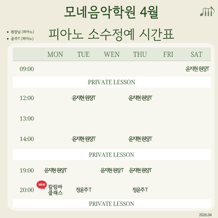 26년 4월 피아노 소수정예 시간표 - 울산성인피아노
