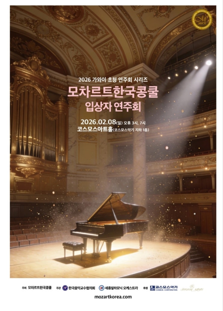 2026년 2월 8일 일요일 모차르트 콩쿨 2차 대회까지 좋은 성적을 거둬둔 예쁜 제자의 첫번째 입상자 연주회가 있었어요. 예쁜 제자의 순서는 두 번째였고, 피아노연주로는 첫 번째였답니다! 연주할 곡은 2곡이었습니다. J.S. Bach - Prelude in C Major W. A. Mozart - Piano Sonata No.2 in F Major, K.280, 3rd. 근처 연습실에서 연습하면서 헤어와 메이크업은 제가 직접 해보았는데, 저도 긴장을해서 머리 묶어줄때 머리카락이 조금 빠져서 미안했답니다 ㅠㅠ ㅎㅎㅎ ( 다음에는 안아프게 해줄게 ❤️ ) 리허설때 입장,퇴장 인사하는법 배우는 사진이랍니다. 친절하게 알려주신 관계측 선생님들께 감사했....... <img src="https://blogthumb.pstatic.net/MjAyNjAyMTJfMjI4/MDAxNzcwOTA0Nzg2OTU5.J0ccfXpZJL5uv6ubEmdzaerWeGuM7dxr45Ysbhi-nm0g.abTVUShSx5L7ZnHlMIpTwcJtKvCO0yhK9Uixg6RfdcMg.JPEG/900%A3%DF1770904466113.jpg?type=s3" />
