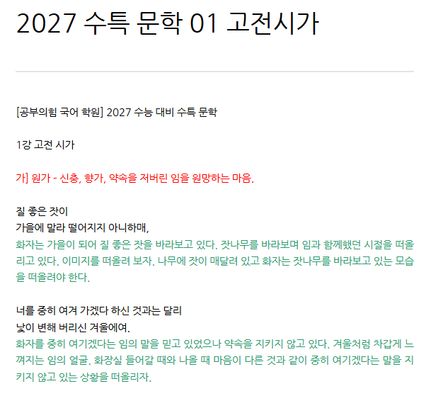 [공부의힘 국어 학원] 2027 수능 대비 수특 문학 1강 고전 시가 가] 원가 – 신충, 향가, 약속을 저버린 임을 원망하는 마음. 질 좋은 잣이 가을에 말라 떨어지지 아니하매, 화자는 가을이 되어 질 좋은 잣을 바라보고 있다. 잣나무를 바라보며 임과 함께했던 시절을 떠올리고 있다. 이미지를 떠올려 보자. 나무에 잣이 매달려 있고 화자는 잣나무를 바라보고 있는 모습을 떠올려야 한다. 너를 중히 여겨 가겠다 하신 것과는 달리 낯이 변해 버리신 겨울에여. 화자를 중히 여기겠다는 임의 말을 믿고 있었으나 약속을 지키지 않고 있다. 겨울처럼 차갑게 느껴지는 임의 얼굴. 화장실 들어갈 때와 나올 때 마음이 다른 것과 같이 중히 여기겠다는....... <img src="https://blogthumb.pstatic.net/MjAyNjAyMjBfMTUy/MDAxNzcxNTYzNDE3MTQ1.wP__d8gFOHFPV9n1DGOjwdNhu6W0fWo8-cSLgnbAkxQg.WLnBdzjcGhXFFoRctmUDmOLoYzAew3BEL-dqXGBJJkgg.PNG/2026-02-20_13%3B56%3B10.PNG?type=s3" />
