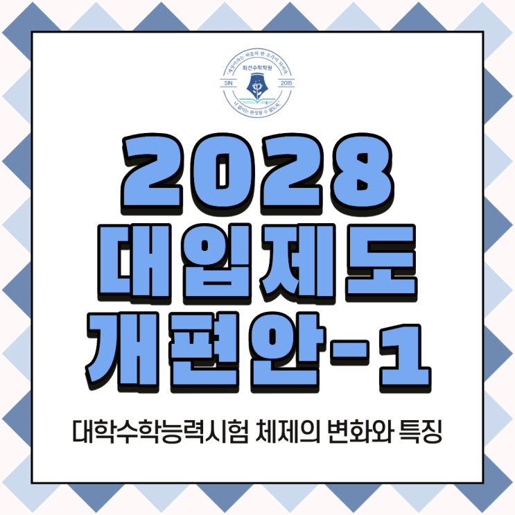 안녕하세요, 최선수학학원입니다! 오늘은 내후년부터 적용될 예정인 2028학년도 대입제도 개편안에 대해 알아보도록 하겠습니다. 2028학년도 대입제도 개편안이 확정되면서 학부모님과 학생들의 관심이 매우 높아지고 있습니다. 이번 개편은 단순한 과목 조정이 아니라, 고교학점제 전면 시행(2025년)에 맞춰 대입 체제를 전반적으로 정비하는 큰 변화입니다. 내용이 긴 편으로, 두세 개의 글로 나누어 업로드 될 예정인데, 이번 1편에서는 ✔ 2028 대입 개편의 배경과 핵심 방향을 간략히 정리하고 ✔ 본격적으로 대학수학능력시험 체제의 변화와 특징을 자세히 살펴보겠습니다. 2028학년도 대입제도 개편 ① 수능 체제, 어떻게 달라지나? 1. 20....... <img src="https://blogthumb.pstatic.net/MjAyNjAyMjBfMTc3/MDAxNzcxNTc3MTY5MTQ4._Pq3FH8DarxeuvVRn6Hn5UQQcx_obMKMP8R6cNwXTGMg.Lm3ueuajOx1XT3xDsDpbf8Sh0eWeaEFdo4va4Z_1R4Ug.PNG/1.png?type=s3" />