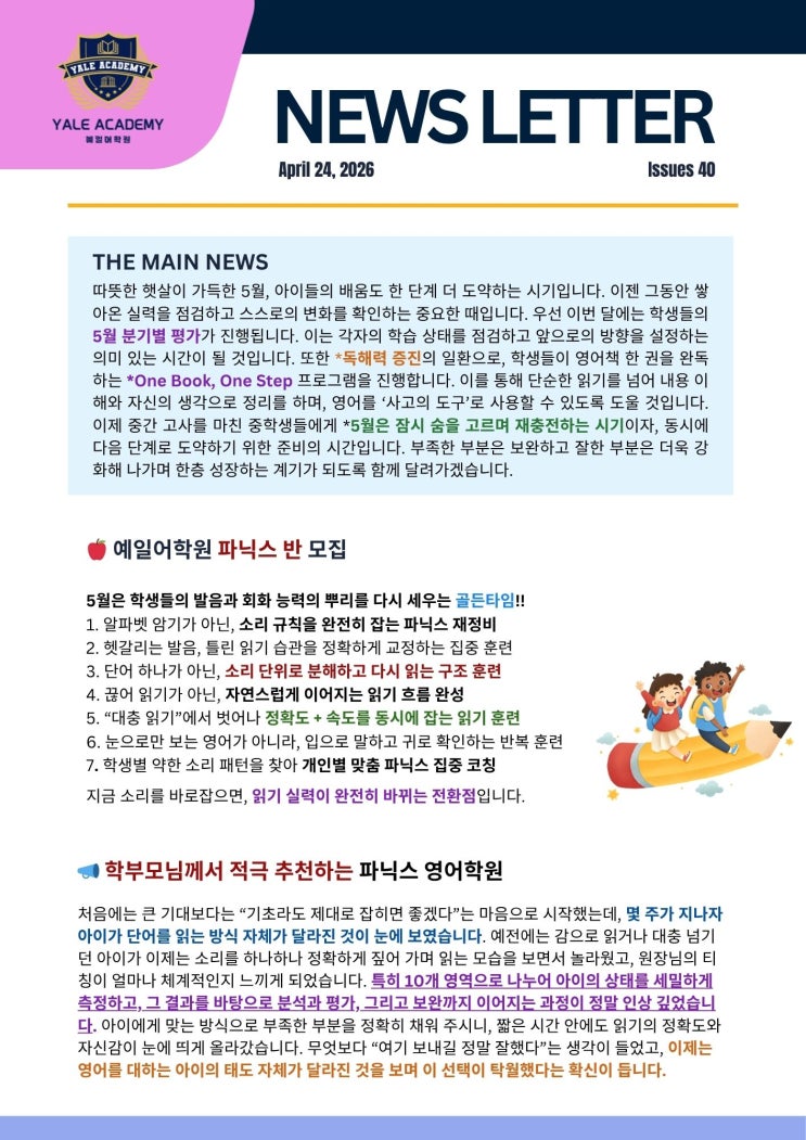안녕하세요. 예일퀸입니다. 따뜻한 봄을 지나, 어느덧 성장의 에너지가 더욱 짙어지는 5월을 맞이하게 되었습니다. 지난 한 달 동안도 학생들과 함께 의미 있는 결실을 만들어 낼 수 있어 진심으로 감사드립니다. 무엇보다 기쁜 소식은, 고려대 전반기 전국 스피킹 대회에 출전한 10명의 학생 전원이 최우수상 및 우수상을 수상하는 값진 결과를 이루었다는 점입니다. 단순한 성과를 넘어, 학생들이 꾸준히 쌓아 온 발음, 표현력, 자신감이 실제 무대에서 증명된 매우 의미 있는 결과입니다. 함께 응원해 주신 모든 학부모님들께 깊이 감사드립니다. 이러한 결과와 더불어, 예일퀸은 한 가지 중요한 교육적 방향에 대해 깊이 고민해 왔습니다. 그....... <img src="https://blogthumb.pstatic.net/MjAyNjA0MjRfODIg/MDAxNzc2OTkyMjYyMDUx.XYwfR4zTj2YQRaR-CqrjQQ2aDChuT-LZnKTlUr3O1sog.7Z6M5lsOtCPEYIUoqJqercEukLo9IpLKhmnI1jf105Ag.JPEG/1.jpg?type=s3" />