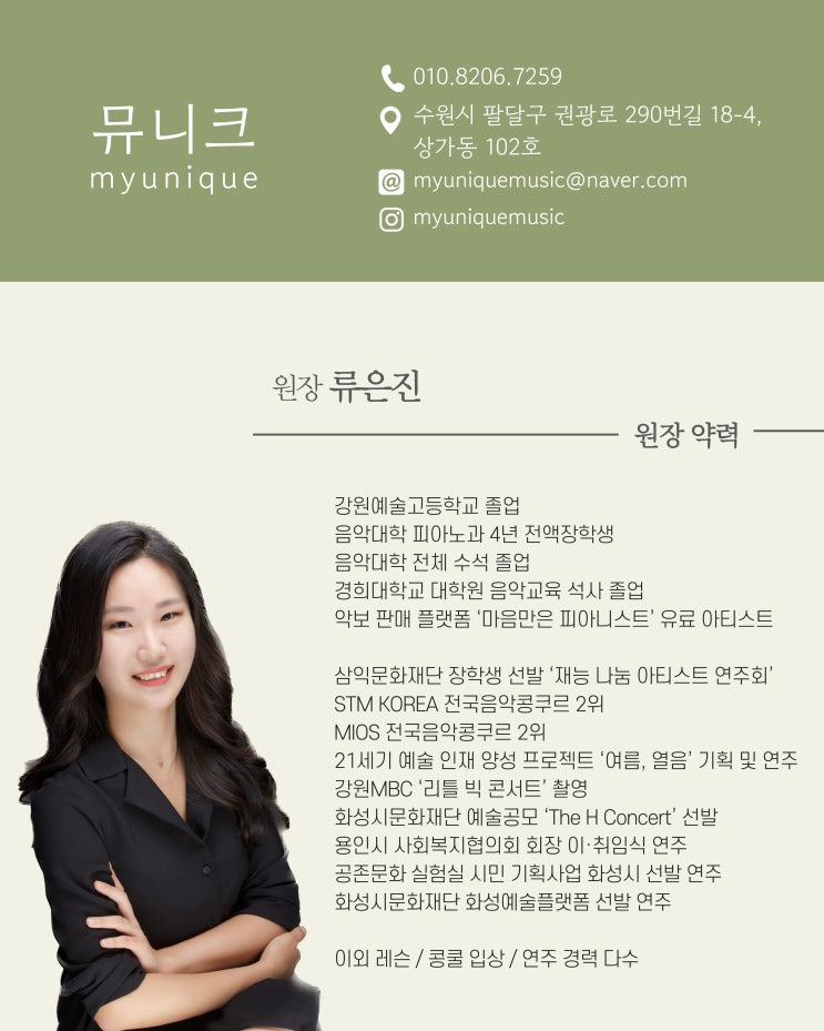 My unique music MYUNIQUE 음악이 주는 즐거움과 힘을 믿습니다. 뮤니크에서는 단순한 연주를 넘어 피아노를 평생 좋아하게 만드는 법을 가르칩니다. 삶을 환하게 채워줄 평생 친구를 뮤니크에 오는 모든 이들에게 선물하고 싶습니다. 안녕하세요. 뮤니크 원장 류은진입니다. 피아노가 좋아서 시작한 길이 지금은 그 즐거움을 나누는 일이 되었습니다. 뮤니크에서는 단순히 피아노를 배우는 것을 넘어 음악을 좋아하게 되는 경험을 만들어가고 있습니다. 뮤니크와 함께하는 모든 수강생들의 삶에 음악의 즐거움이 머물기를 바랍니다. 수원 인계동 피아노 레슨 뮤니크음악교습소 류은진 원장 소개 예술고등학교 졸업 수도권 음악대학 피아노과 4년....... <img src="https://blogthumb.pstatic.net/MjAyNjAzMTJfNjYg/MDAxNzczMzIwNzM2NTY5.575qKf6_rQ-pP7cyPbwUePEX35NKZ4Clb-DKFtGEcdog.i01z6tqyDB-9eRefecV6adyjxmgvzOYAXGwzV1pCPUcg.JPEG/2026%BF%F8%C0%E5%BC%D2%B0%B3.jpg?type=s3" />