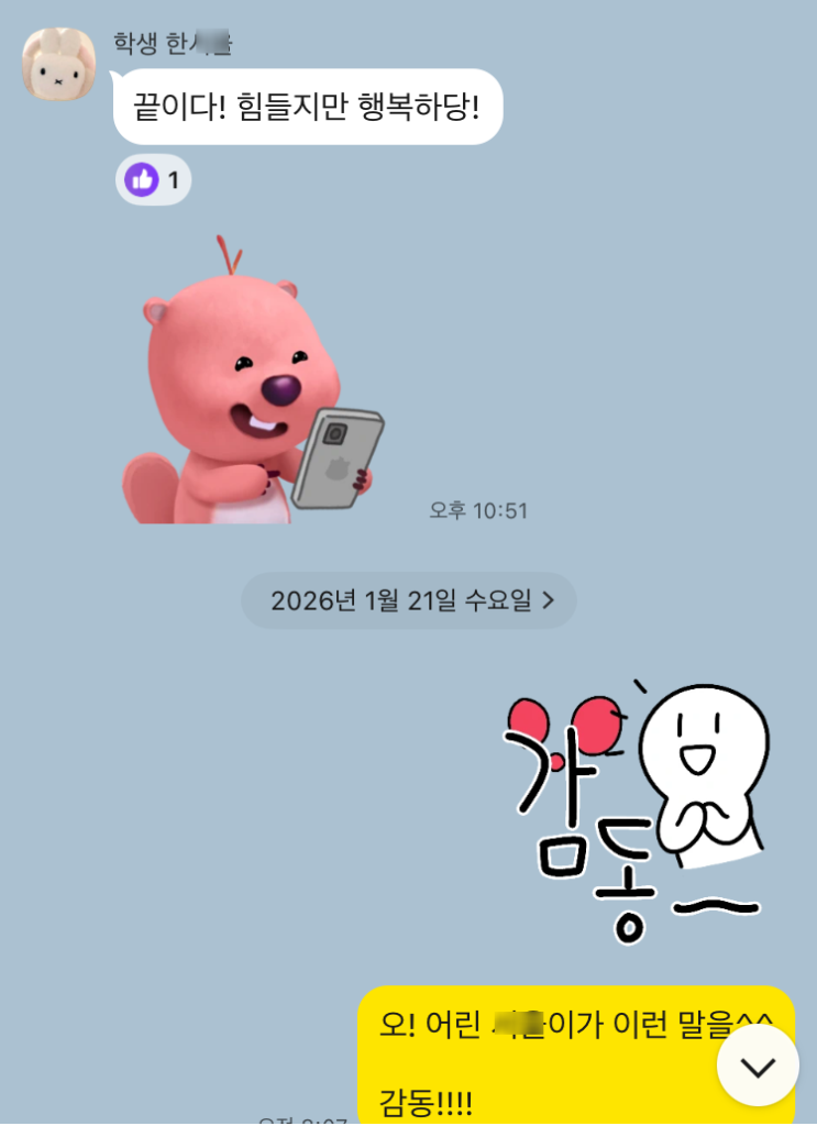 "힘들지만 행복해"초등 4학년 학생의 카톡이 주는 감동!!!(광교초 영어, 광교중 영어, 웰빙타운 영어학원, 광교초, 광교중 내신대비, 애니소리영어, 반듯한 영어학원)