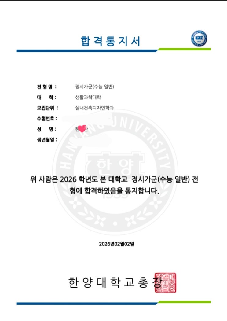 합격을 축하합니다!! 보평고 한*찬 학생이 한양대 실내건축디자인 정시에 최종 합격했습니다. 고1때부터 저와 수학을 시작했을 땐, 어렵거나 복잡한 문제는 풀기 싫어하고 힘들어했는데 열심히 공부하는 주변 친구들에 자극을 받고 그 이후부터는 저희 교재뿐 아니라 모의고사, 프랜차이즈 사설 문제집 등을 집중적으로 풀어 수학 수능 1등급을 받았습니다. 서강대도 정시에 합격했으나 한양대에 최종 등록을 했습니다. 다시 한 번 합격을 축하합니다. <img src="https://blogthumb.pstatic.net/MjAyNjAyMDlfMjA4/MDAxNzcwNjE1NTU2MjEx.ebNd4ElgQfcXOj2l7AKKmh3LMCuBQXrD8WRKd9P3h2Ig.kb0GLCMi9e-SND8dy10EZuUS9-wKK1Gl7AD0H2RaZ_og.JPEG/KakaoTalk_20260209_143650450.jpg?type=s3" />