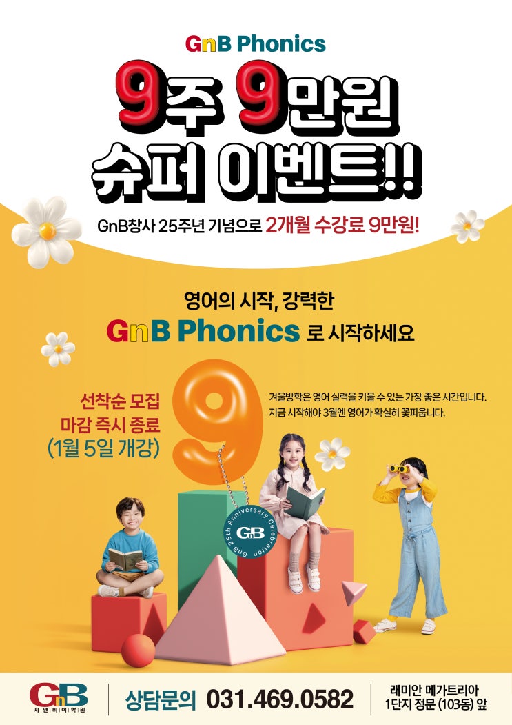 안녕하세요^^ 지앤비어학원 안양캠퍼스입니다. GnB창사 25주년 기념으로 GnB Phonics 2개월 수강료 9만원!!! 9주 9만원 슈퍼 이벤트!!! 2개월간 매일 자음, 모음을 학습하여 쉽고 재밌으면서 기초부터 탄탄하게~~~ 영어실력을 키울수 있는 가장 좋은 시간입니다. 지금 시작해야 3월엔 영어가 확실히 꽃피웁니다. (선착순 모집, 마감즉시 종료) 발음실력up^^ 자신감up^^ ● 개강 : 2026년 1월 5일(월) ● 시간 : 2:30 ~ / 3:30 ~ / 4:30 ● 대상 : 예비초 ~ 초등4학년 ※ 재학생 특전 - 재학생 동생이 등록할 경우 - 1개월 형제 각각 5만원 할인 ※ GnB추천 EVENT(1월등록에 한 함) - 주변 학부모님께 Class추천 후 1월 신입등록시 - 재학생 5만원....... <img src="https://blogthumb.pstatic.net/MjAyNTEyMDlfMTg1/MDAxNzY1MjgzNTcyMjYz.BQf91whzrtRsbqwWyeny2tidV0PvPh2nnCeGcQNaGLMg.IOZ2rc6uYTJhB7XrQu9AKn6B5ChJXiSthMpfWrKiEOsg.JPEG/KakaoTalk_20251202_145639391_01.jpg?type=s3" />