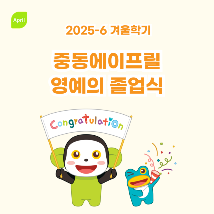 안녕하세요! 청담에이프릴어학원 부천중동 캠퍼스 입니다! 이번 학기부터 중동분원을 졸업하게 되는 영예의 졸업생들을 축하하기 위하여 즐겁고 행복한 졸업식을 진행하였습니다. :) 1. 초6 졸업생 26년도 새로운 한 발을 내딛게 되는 우리 초6학년 학생들을 중동에이프릴이 진심으로 축하합니다! 중학교에 진학해서 더욱더 멋지게 성장할 모습을 기대합니다~ 2. Junior Master 2 졸업생 에이프릴어학원의 꽃 주니어마스터 2 레벨을 성공적으로 완수한 우리 자랑스러운 학생들! 청담어학원으로 연계하여 더 높이 도약할 준비를 하고 있습니다~♡ 우리 친구들과 함께 할 수 있어 매우 행복하고 뜻깊었던 중동에이프릴 입니다! 언제나 믿고 격려해....... <img src="https://blogthumb.pstatic.net/MjAyNjAzMDNfMTMy/MDAxNzcyNTE4MTA1NjY4.BryLr7srcfyXZQdzkkPdjgv_fNtmBQ3pBKzkUjbIR8gg.mQSJSH4orsZ5gWQrwGuNdqL92x1wH_9CngVrdXooTr4g.PNG/%BA%ED%B7%CE%B1%D7-%C4%BF%B9%F6_%BA%B9%BB%E7%BA%BB-069.png?type=s3" />