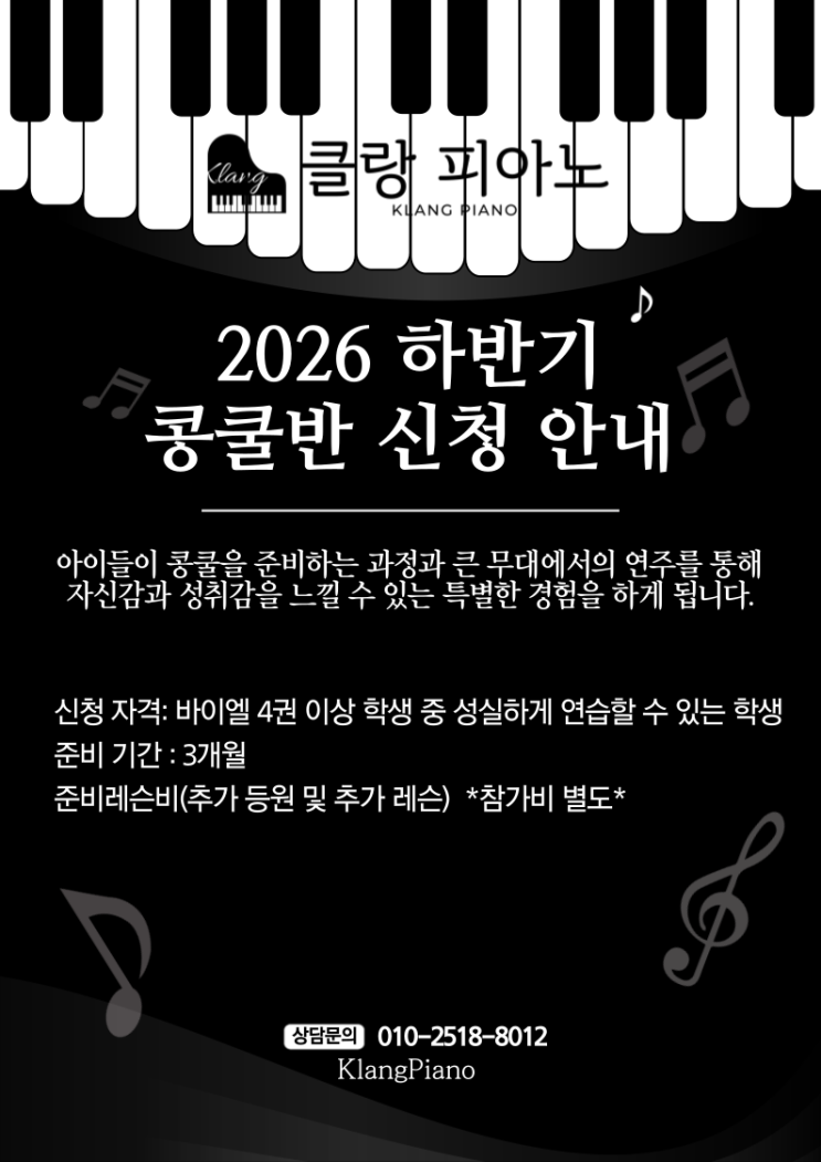 안녕하세요 클랑피아노입니다. 2026년 하반기 콩쿨 참가 신청을 안내드립니다. 아이들이 콩쿨을 준비하는 과정과 큰 무대에서의 연주를 통해 자신감과 성취감을 느낄 수 있는 특별한 경험을 하게 됩니다. 대회의 결과를 떠나 연주곡을 완성도 있게 준비하는 과정에서 성취감을 얻게 될 것입니다. 우리 아이들이 한층 더 성장할 수 있기를 바랍니다. ✨클랑만의 특별함✨ [프리미엄 음악 교육] 젊은 감각과 열정, 실력을 갖춘 예고, 음대, 피아노 석사 학위 원장선생님이 1:1로 직접 지도하며 관리함으로써 전문적인 피아노 교육을 받을 수 있습니다. [소수정원제 수업] 소수정원 시스템으로 체계적이고 깊이 있는 음악 교육을 받을 수 있습니다. ....... <img src="https://blogthumb.pstatic.net/MjAyNjAzMTJfNCAg/MDAxNzczMjk5NTA2MzUz.MK8Bw834ySd2_nx0Jv22j33zhqyHt8FLvD4_YMilcNgg.dtaKGjPG2KFQHdyFlyJO5tLw0CxNHNZHgYA4chyc7e0g.PNG/%C1%A6%B8%F1%C0%BB%A3%AD%C0%D4%B7%C2%C7%D8%C1%D6%BC%BC%BF%E4%A3%DF%A3%AD001_3.png?type=s3" />