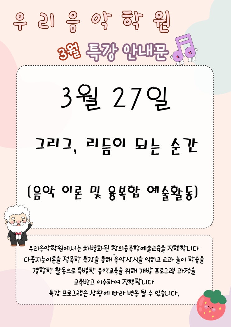 안녕하세요:) 우리음악학원 입니다. 한 달에 한 번, 우리음악학원에서는 특별한 음악특강 수업을 진행합니다. 3월 27일(금) 그리그, 음악이 되는순간 3월에도 알차고 유익한 수업이 되길 바라봅니다. <img src="https://blogthumb.pstatic.net/MjAyNjAzMTJfOTgg/MDAxNzczMjg4NjI5MDMx.LFNnobeGYZC6Voe-tQsthc9ktwesfGHdcWgY7L24dj4g.fw6j4DmEbFsRGkx3MLQwa8IOCMhK8A13r075IrnrCeUg.JPEG/3%BF%F9%BE%C8%B3%BB%C0%E5.jpg?type=s3" />