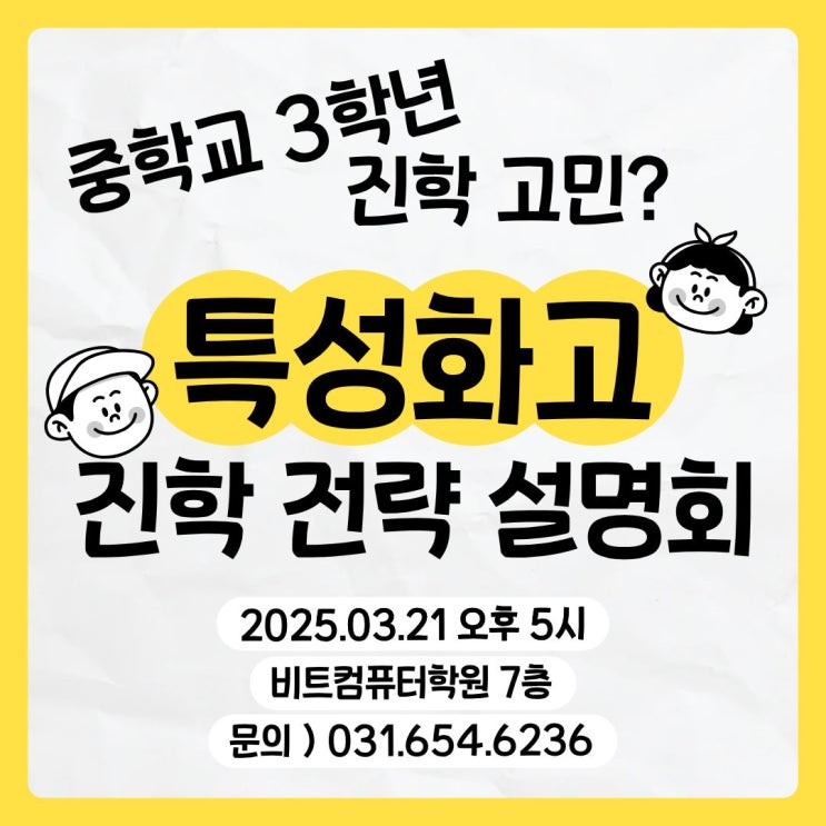 안녕하세요, 평택 특성화고전문학원 평택 비트컴퓨터학원&비트학원입니다. 어느덧 중3 학생들의 1학기 중간고사가 약 한 달 앞으로 다가왔습니다 지금쯤이면 시험 준비와 함께 고등학교 진학에 대한 고민도 함께 시작되는 시기인데요 ! ✔ 우리 아이 내신으로 어느 학교를 지원할 수 있을까? ✔ 인문계고가 나을까, 특성화고가 더 맞을까? ✔ 대학 진학이나 취업은 어떻게 준비해야 할까? 이처럼 고민은 깊어가지만, 막상 정확한 정보를 얻기 어려워 답답하신 경우가 많습니다 22년동안 평택 지역 특성화고를 전문적으로 교육해온 비트컴퓨터학원&비트학원에서 학부모님들과 학생들의 고민을 해결할 수 있는 정보들을 '특성화....... <img src="https://blogthumb.pstatic.net/MjAyNjAzMTZfOTkg/MDAxNzczNjYzMjkwMjk5.ZIre3N7IcH-xkwACPijItQ4OHyt-yYGiP2gfzeAIBa0g.Md_EfY4VOrvtTakEDdTfnNjtxIt2IPTEB-0s7Nm7Rkkg.JPEG/1.jpg?type=s3" />