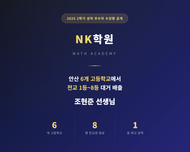 "우리 아이 수학 성적, 도대체 어떻게 해야 오를까?" 고등학교에 올라가면서 수학이 갑자기 어려워졌다는 아이, 학원을 다녀도 성적이 제자리인 아이를 보며 속이 타는 학부모님들이 정말 많으십니다. 오늘은 2025년 2학기, 안산 지역 6개 고등학교에서 전교 1등부터 8등까지 배출한 NK학원 조현준 선생님의 수업을 소개해 드리겠습니다. 성적표가 아닌, 학생들이 직접 쓴 수강평으로 보여드립니다. NK학원 조현준T, 성적 우수자 한눈에 보기 한 학교가 아닙니다. 고잔고, 양지고, 성포고, 안산고, 송호고, 강서고까지 안산 지역 6개 고등학교, 8명의 학생 전원이 전교권 성적을 달성했습니다. NK학원 수강평 — 학생들의 진짜 목소리....... <img src="https://blogthumb.pstatic.net/MjAyNjAyMTlfNTIg/MDAxNzcxNDM2MzM2NzI5.01gNRMATtO_Kudgx0cwEXBGinK2XJelJaPol0OmQKFkg.8eKafuHgoCU43zhKoYNdJX_N_nw6s-V6od_IOYF9ZCQg.PNG/image.png?type=s3" />