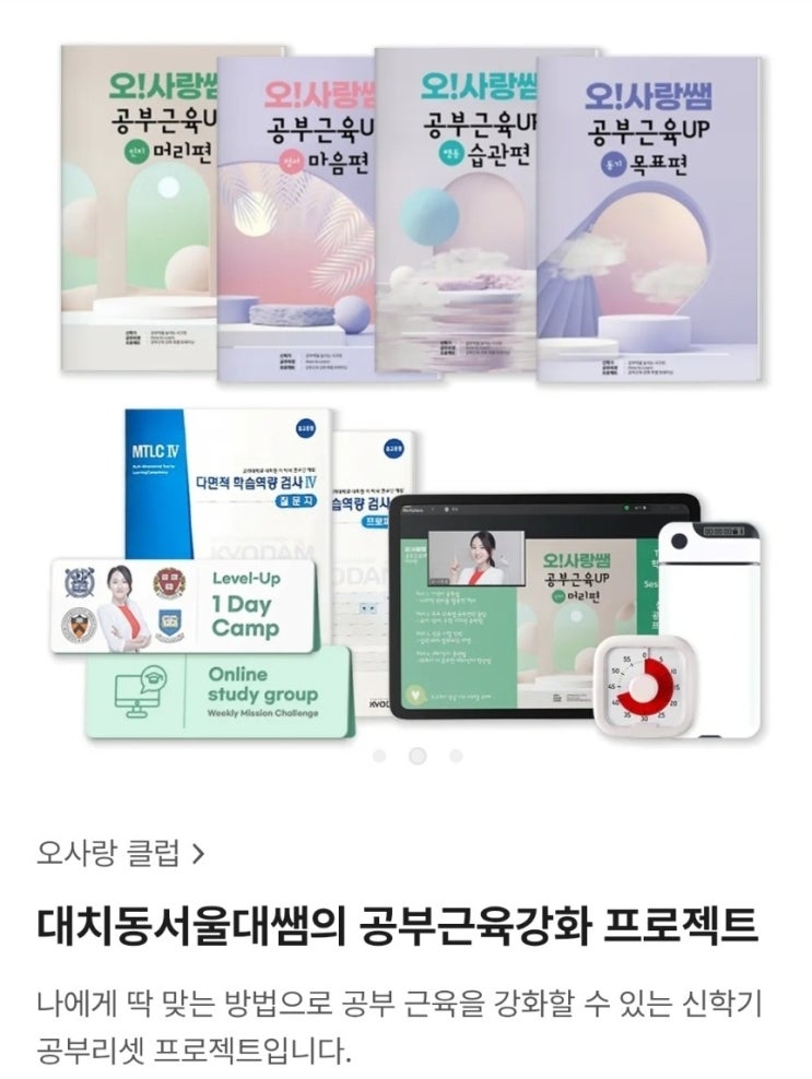 상위 1% 대치동 학습코칭전문가 신학기 공부리셋 선물 패키지 https://tumblbug.com/oh_sarang 혹시 이런 공부 고민 있으신가요? 공부를 왜 해야 하는지 모르겠어요. 공부를 하려고 하면 짜증이 나요. 공부하려고 책상에만 앉으면 집중이 잘 안되요. 항상 공부 계획만 세우고 막상 실천하기가 어려워요. 아무리 노력해도 성적이 오르지 않아요. 이런 고민을 한다는 것은 여러분 내면에 공부를 잘 할 수 있는 잠재력이 이미 존재한다는 의미입니다. 여러분이 누구보다 공부를 잘 하고 싶은 마음이라는 것을 알고 있습니다. 여러분이 누구보다 성실히 열심히 해오고 있음을 알고 있습니다. 문제는 의지가 아닙니다. 문제는 훈련입니다! 어떻게 싸우....... <img src="https://blogthumb.pstatic.net/MjAyNjAyMDhfMjYy/MDAxNzcwNTIxODcwNTUy.dfHYkc8udVxSfhfRKucqwO5geKf7NSYwLJGICyBCaJsg.epMMYKMZkTcUZje27akf0Tqgk8zRuCXw2VggKO31maIg.JPEG/1770520996365.jpg?type=s3" />