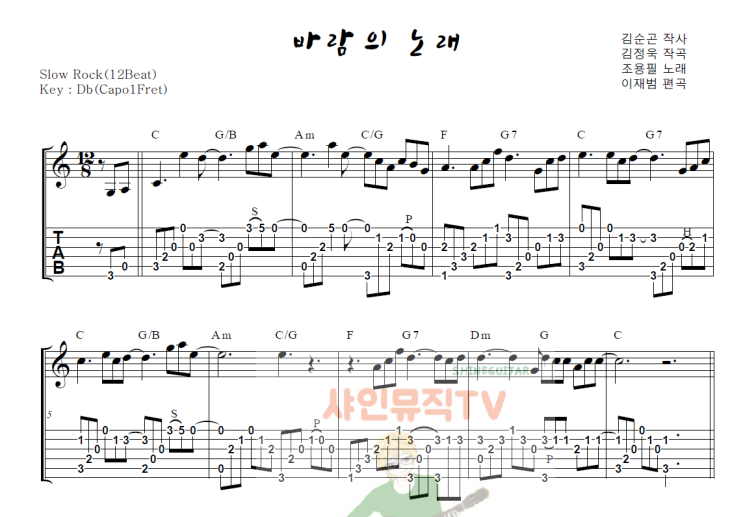 오늘 올려드리는 악보는 국민가왕 조용필님의 바람의 노래 입니다. 유튭채널의 신청악보이기도 합니다. 곡 전체를 원곡의 느낌을 살려서 악보로 제작을 하였습니다. 두번째 중간 일렉기타 솔로부분만 리듬으로 표기하였는데요 그부분은 통기타로 연주가 도저히 어렵기 때문에 슬로우 록 반주로 표기하였으며 마지막 섹션부분은 표기 되었습니다. 원키는 Db이며 카포는 1프렛에 끼우고 연주하시면 되겠습니다. 악보 및 편곡은 샤인실용음악학원의 원장님이시며 호원대학교 실용음악학부의 겸임교수님으로 계시는 이재범교수님께서 만들어주셨습니다. 샘플 악보가 장난이 아닙니다. 고퀄의 악보를 무료로 제공하는 클라스가 샤인실용음악학원입니다....... <img src="https://blogthumb.pstatic.net/MjAyNjAyMDlfMjYy/MDAxNzcwNjI1NDA0OTYw.md4sOrVE6ow3HysFQIcTL8n2o-dqKUgHhRjLWQw0cxog.BM_VhKyjpRmnI6eshC86rKDHL6Zsbdb2nBgNumAZ_NMg.PNG/Cap_2026-02-09_17-23-18.png?type=s3" />
