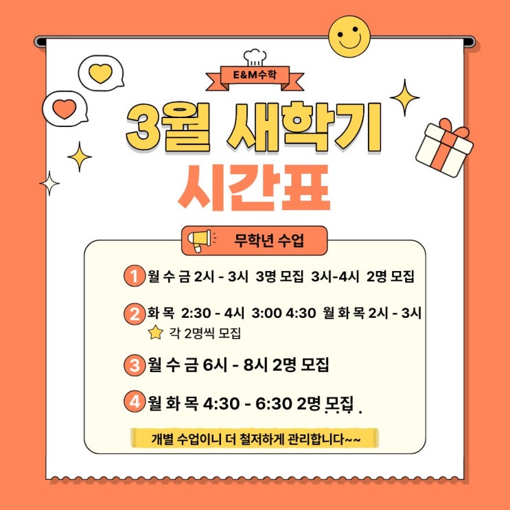 새 학기를 앞두고 우리 아이들이 새로운 학년, 새로운 단원을 잘 따라갈 수 있을지 걱정되시죠? 저희 학원은 이번 신학기를 다른 곳보다 '일주일 먼저' 시작하려 합니다. 단순히 진도를 빨리 나가는 것이 목적이 아닙니다. 아이들이 수학을 '어려운 숙제'가 아닌 '할만한 공부'로 느끼게 만들기 위한 전략적인 시작입니다. 왜 '일주일 먼저'인가요? 1. 조급함이 사라져야 '이해'가 시작됩니다. 학기가 시작되면 학교 진도를 따라가기 바빠집니다. 하지만 이해력이 조금 부족하거나 수학을 어려워하는 아이들에게 가장 필요한 것은 '충분한 시간'입니다. 일주일 먼저 시작해서 개념....... <img src="https://blogthumb.pstatic.net/MjAyNjAyMTJfMjQx/MDAxNzcwODcwNjEwMTc2.8KTbV397CuGhdvObit8aiYi3KXrwF-5rCd-Py_gAWDcg.B0MYGKozxOBbi0bOgtwdXdT_LtNa4nDEXmGw4-9JYZIg.JPEG/%C1%A6%B8%F1%C0%BB_%C0%D4%B7%C2%C7%D8%C1%D6%BC%BC%BF%E4._%2822%29.jpg?type=s3" />