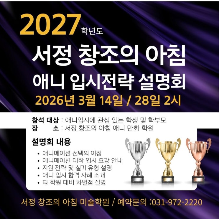 애니메이션 입시 준비, 언제 시작해야 할까? 안녕하세요? 행신만화학원 서정 창조의아침입니다. 요즘 웹툰과 애니메이션 산업이 성장하면서 애니메이션 관련 대학 진학을 목표로 하는 학생들이 꾸준히 늘어나고 있습니다. 하지만 많은 학생들이 애니 입시를 준비하면서 이런 고민을 합니다. “애니 입시는 언제부터 준비해야 할까?” “웹툰과 애니메이션 입시는 무엇이 다를까?” “어떤 대학을 목표로 준비해야 할까?” 이 질문에 대한 답은 하나입니다. 입시는 방향이 가장 중요합니다. 그래서 행신만화학원 서정 창조의아침 애니창아에서는 애니 입시를 준비하는 학생과 학부모를 위해 2027학년도 애니 입시전략 설명회를 준비했습니다. 애니....... <img src="https://blogthumb.pstatic.net/MjAyNjAzMTNfMjU0/MDAxNzczMzk0MzIzODk3.JOCxsFAbeOrOpLV5SSFNiJ1qTb9bKnCMfVhYFb4cC4Ig.O1ynI_QJk5x6QYSqApX-YVd7mkMc_ei5qZh92jgYNwAg.JPEG/2027%C7%D0%B3%E2%B5%B5_%BC%AD%C1%A4_%C3%A2%C1%B6%C0%C7_%BE%C6%C4%A7%BE%D6%B4%CF_%C0%D4%BD%C3%C0%FC%B7%AB_%BC%B3%B8%ED%C8%B8_%281%29.jpg?type=s3" />