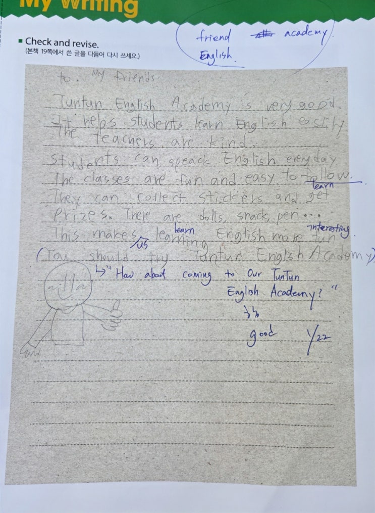 초등 2~3학년에 ‘통문장 쓰기’가 가능한 이유 말할 수 있는 아이는, 결국 쓸 수 있습니다 “우리 아이가 벌써 영어로 글을 쓴다고요?” 처음 이런 이야기를 들으시면 놀라시는 학부모님들이 많습니다. 하지만 조금만 들여다보면, 사실 아주 자연스러운 흐름입니다. 말할 수 있는 아이는, 결국 쓸 수 있기 때문입니다. 말하기가 먼저입니다. 영어를 ‘공부’가 아니라 ‘언어’로 바라보면 답은 간단해집니다. 아이가 하고 싶은 말을 영어로 꺼낼 수 있고, 자신의 생각을 자연스럽게 표현할 수 있다면, 그 다음 단계는 ‘쓰기’입니다. 그래서 저희는 초등 2~3학년부터 조금 이른 시기라고 느껴질 수 있지만, 통문장 쓰기를 자연스럽게 시작합니....... <img src="https://blogthumb.pstatic.net/MjAyNjA0MjBfMTM3/MDAxNzc2NjcxNDM2NjY1.20PvA4fFneXPbbGEYbAoMNjoVHMNdPTIEkF9lLYJRx8g.FXCBnxB9jZVG2qPA23-EROACvRPHgJAsAtT3r4RlW58g.JPEG/20260122_182357.jpg?type=s3" />