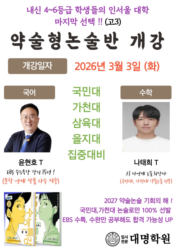내신 4~6등급 학생들의 인서울 대학 마지막 선택 ! 2027 약술논술 기회의 해 ! 국민대, 가천대 논술로만 100% 선발 EBS 수특, 수완만 잘해도 합격 가능성 UP!! 상담문의 : 031-603-3131 <img src="https://blogthumb.pstatic.net/MjAyNjAyMjFfNjgg/MDAxNzcxNjYwOTUzNDk4.yX1UdsBZPbMVEQ7OnaTEJtIWtzgT6bcMMXdCGXQAl9Ig.Bx0oog7wmupRPWatO_Q06pfPO6jEoBWhTW0lZ4vemNAg.JPEG/%BE%E0%BC%FA%B3%ED%BC%FA_%C8%AB%BA%B8%B9%B01.jpg?type=s3" />