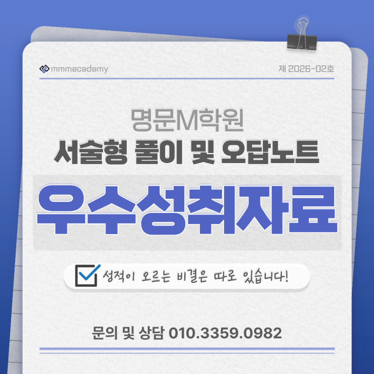 안녕하세요. 거북섬 수학전문학원 명문M학원입니다. 학부모님들께서 가장 많이 하시는 질문 중 하나는 우리 아이, 공부는 하는데 왜 성적이 오르지 않을까요? 입니다. 성적은 단순히 문제를 많이 푸는 것으로 결정되지 않습니다. 틀린 문제를 어떻게 관리하고, 풀이 과정을 어떻게 정리하느냐에 따라 결과가 달라집니다. 오늘은 실제 성적 향상으로 이어지고 있는 명문M학원의 우수성취자료 관리 방법을 소개해 드리겠습니다. 성적이 오르는 학생들의 공부는 다릅니다. 시험 점수는 단기간의 노력보다 지속적인 관리와 올바른 학습 습관에서 만들어집니다. 명문M학원에서는 학생들의 성장을 위해 오답노트 관리와 서술형 풀이 훈련을 체계적으로....... <img src="https://blogthumb.pstatic.net/MjAyNjAyMjBfMTQ1/MDAxNzcxNTY1NzMyNjU4.iq81KYbMEmNh4sE_s_yL87ldUSmN0LDsg0pNO_1l66Mg.VWeGQeNs26ZHWiSq7LBcZJSj-_snaYxfNHImlmix8oEg.PNG/1.png?type=s3" />