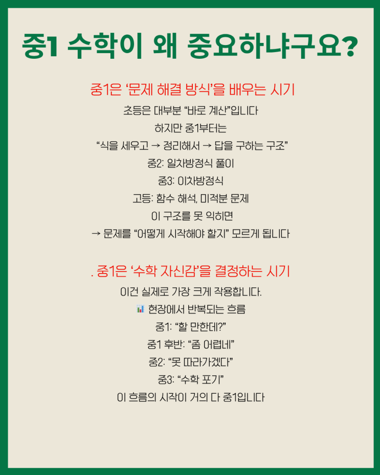 고등수학 수업이 가능한 중고등 수학학원입니다. 그렇기에 당장의 성적만을 보고 가르치지 않습니다. 단계단계 단단히 쌓아야 고등가서 무너지지 않는다는걸 알기에 자꾸자꾸 반복합니다. 그렇기에 당연히 학생들 힘듭니다. 다른학원의 두배세배의 학습량이라고 하죠? 당연하죠~ 두배 세배를 쌓아주려고 하는데요. 그렇기에 당연히 학생들 힘듭니다. 그럼에도 적응이후의 만족도는 '비교불가! 대체불가! '라고 확신합니다. 그만큼 단단히 가르칩니다. 공부할 준비가 되어있는 학생들! 그리고 흔들리지 않고 응원해주실수 있는 학부모님들! 드디어 우리 학원도 중1 신규등록이 가능합니다. <img src="https://blogthumb.pstatic.net/MjAyNjA0MjVfMjcy/MDAxNzc3MDk1Mzc1MDE5.hQOxWRujWO4d_IZpT3NTbSiHq7xkUchu8JSHYINy2Msg.J8V-uiorAuMJdAhkVs9MAxD63qv9ziinHm7orI145Dkg.PNG/3.png?type=s3" />