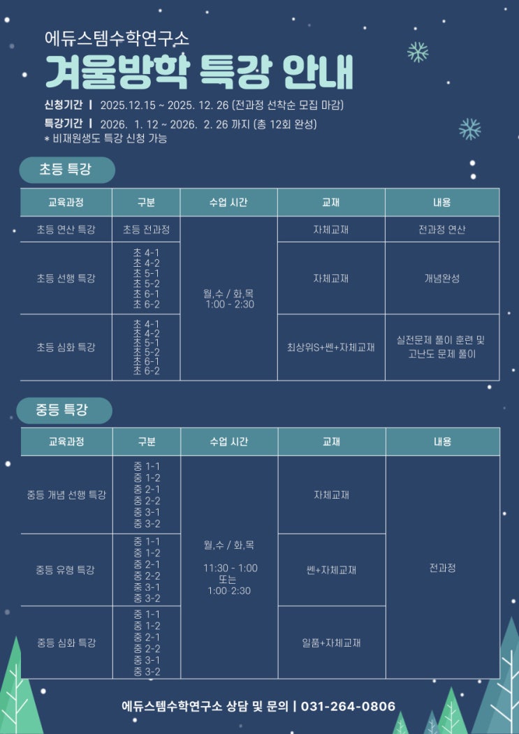 [용인죽전수학학원]에듀스템수학연구소 2026 초•중등부 겨울방학 특강 OPEN!