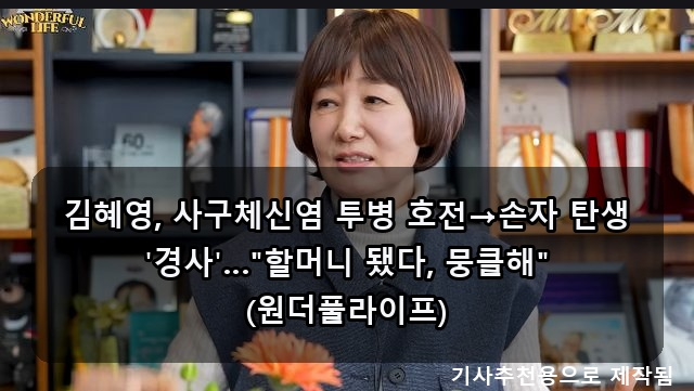 방송인 김혜영 씨가 사구체신염 투병을 이겨내고 손주를 얻는 경사를 맞았습니다. 둘째 출산 후 5년간 투병 생활을 이어온 김혜영 씨는 큰 아이의 출산으로 할머니가 된 기쁨을 나누었습니다. 한편, ‘흑백요리사2’를 빛낸 요리 전문가들이 손석희 앵커와 만나는 특별한 시간이 마련되었습니다. 이들은 ‘손석희의 질문들’에 출연해 요리 경연 비하인드 스토리를 공개할 예정입니다. 김혜영, 사구체신염 투병 호전→손자 탄생 '경사'…"할머니 됐다, 뭉클해" (원더풀라이프) ■ 할머니가 된 김혜영, 사구체신염 투병 극복 후 찾아온 기적 같은 경사 ■ 방송인 김혜영 씨가 할머니가 되었다는 반가운 소식을 전했습니다. 최....... <img src="https://blogthumb.pstatic.net/MjAyNjAzMDlfMjY2/MDAxNzczMDQ4ODg5NzE5.NEPQ2KU9lrQIa5sI1O6bYs1JmiG7cLgwikKOXw9SP84g.jx9MQaoGOHc24YlOyHtYUsHrxwVVaQOxNTzdd16CRJYg.PNG/image.png?type=s3" />