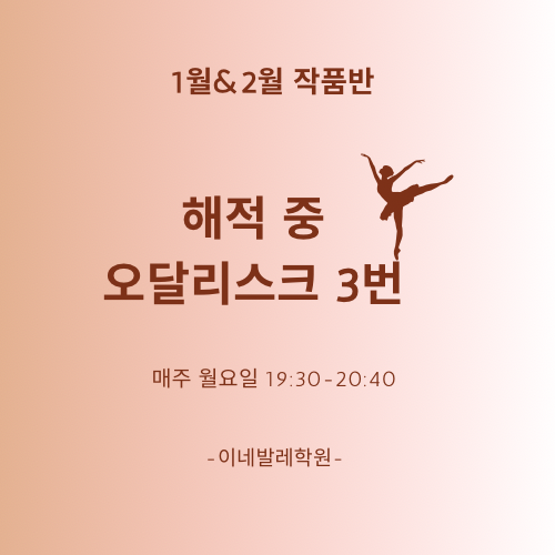 안녕하세요 상왕십리 텐즈힐몰에 위치한 #이네발레 학원입니다 2026년 1,2월 함께 배워 볼 작품은 해적 중 오달리스크 3번 바리에이션입니다 8주 완성 해당 클래스는 발레 기본 동작 수강 경험이 있는 분들 대상으로 작품의 흐름과 표현에 집중하는 수업입니다 작품 순서 보기 (발레리나 마리아 호레바) 발레 해적 줄거리 참고 (테르프 유튜브) 1월부터 참여 원하시는 분들은 편하게 상담 문의 주세요 1월 스케줄&시간표 안내 <상담 문의> 카카오 채널 '이네발레' #inneballet #이네발레 #이네발레학원 #이네발레스튜디오 #텐즈힐발레 #센트라스발레 #성동구발레학원 #성동구발레 #왕십리발레 #상왕십....... <img src="https://blogthumb.pstatic.net/MjAyNTEyMjJfMjcg/MDAxNzY2NDE0NzM5MjQ1.ZRJ8SGnLnoYhlCgh8G-D1VbaU8Squ_m4y8BK6b5M6UAg.TlHbzbAbCEjkqfAnWdtH_KxRLaq7D8tq5fiVtXncnOIg.PNG/Black_And_White_Minimalist_Ballet_School_Logo.png?type=s3" />