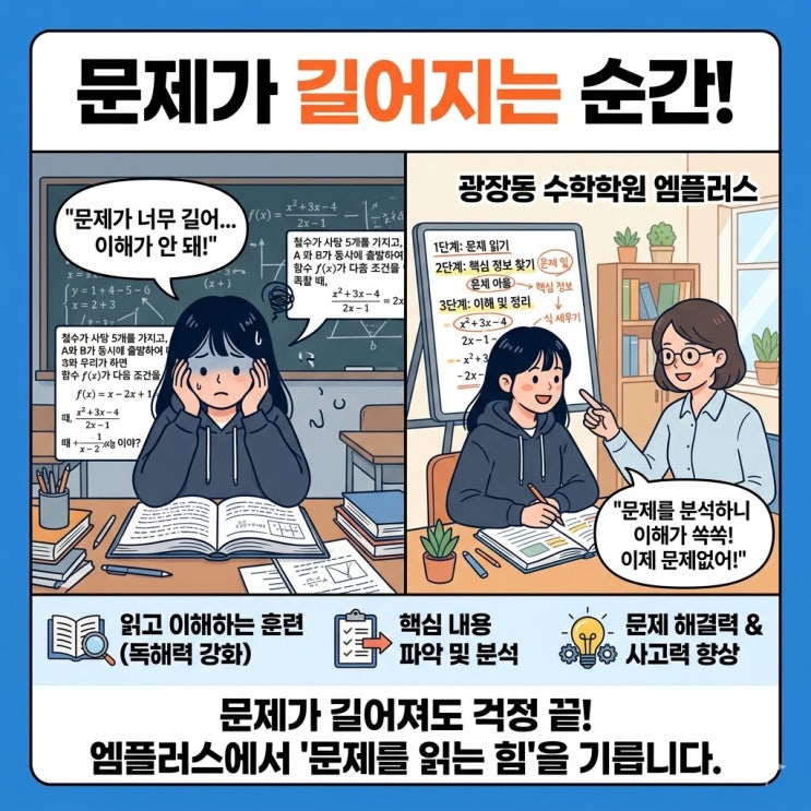 안녕하세요. 광장동수학학원 엠플러스입니다✨ 수학을 잘 따라오던 아이가 어느 순간부터 “수학이 어렵다”고 말하기 시작하는 경우가 있습니다. 부모님 입장에서는 갑자기 왜 이렇게 됐는지 이해가 잘 되지 않는 경우도 많습니다. 하지만 수학은 어느 날 갑자기 어려워지는 과목이 아닙니다. 이미 그 전부터 조금씩 쌓인 변화가 어느 순간 눈에 보이기 시작하는 것입니다. 광장동수학학원 엠플러스에서도 아이들이 수학을 어려워하기 시작하는 시점을 보면 비슷한 패턴이 반복되는 경우를 자주 확인하게 됩니다. 문제가 ‘길어지는 순간’입니다 초등 수학은 학년이 올라갈수록 문장이 길어지고 조건이 많아집니다. 이때부터는 단순 계산이 아....... <img src="https://blogthumb.pstatic.net/MjAyNjA0MjNfMTA4/MDAxNzc2OTIxNTU3NzAx.mW4pxH00dZKuKpaz6kGil-BEZR5WViEn1HL39Io_iTEg.G6m_XXTa30lxtgzrEiioecs5Qf4hdu3kjl5va5Tqjg8g.JPEG/08281dc5-6a2a-4ccc-9e4f-27ea3e5f8e14.jPG?type=s3" />
