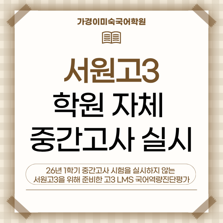 서원고3 학생들을 위한 특별한 시험! 학원 자체 중간고사 실시 안내 가경이미숙국어학원에서 서원고 3학년 학생들을 위해 특별한 국어 역량 진단 평가를 준비했습니다. ✔ 왜 필요한가요? 2026년 1학기 국어 중간고사가 실시되지 않는 상황에서 학생들의 실력을 점검하고 방향을 잡을 수 있는 기회가 부족합니다. 이러한 공백을 채우기 위해 학원 자체 시험 시스템을 활용한 맞춤형 평가를 진행합니다. ✔ 시험 특징 수능특강 기반 시험문제 출제 현재 실력 정확한 진단 개인별 피드백 제공 향후 학습 방향 제시 ✔ 이런 학생에게 추천합니다 중간고사가 없어 실력 점검이 필요한 학생 수능 대비 체계적인 국....... <img src="https://blogthumb.pstatic.net/MjAyNjA0MjRfMjk1/MDAxNzc3MDEzNDE3MTM4.9kFDR0uoge_XWrrKhcxbZvQo0y-wWxUGkD5kKjiYFTwg.-G0vpHD8aE4W-NeeIjYXsdQI6OwitTv9v6yTUaDq_nMg.PNG/%C1%A6%B8%F1%C0%BB_%C0%D4%B7%C2%C7%D8%C1%D6%BC%BC%BF%E4._%283%29.png?type=s3" />