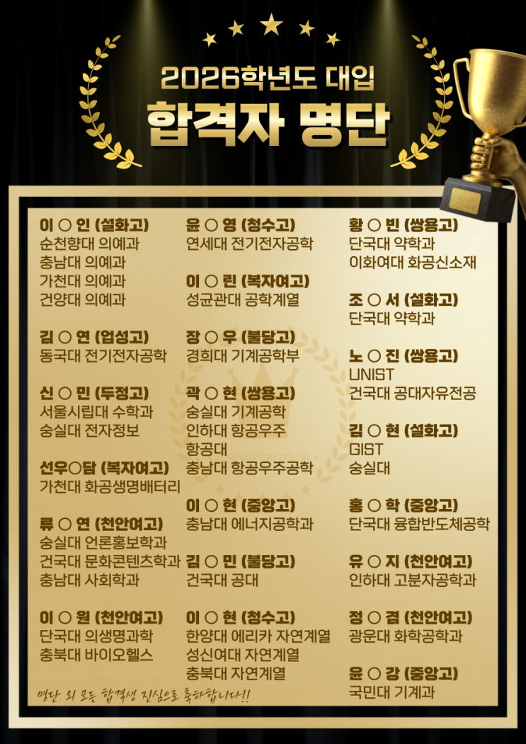 안녕하세요. 301학원입니다. 301은 지금 주말에도 시험 대비를 시작했습니다. 중학교, 고등학교별로 시험 대비를 다르게! 평소 수업 시간에 심화로 복습! 주말에는 개인별로 집중 시험 대비! 301은 늘 그렇게 아이들과 지내고 있답니다^^ 이런 하루하루가 모여 좋은 고등학교도 가고 좋은 대학교도 가고 모두 원하는 바를 이루는 것 같습니다. 나중에 돌아봤을 때 왜 이렇게 했지?라는 후회가 없도록, 정말 최선을 다했다!라고 말할 수 있게 오늘도 잘 가르치겠습니다. 2026년도 대입 결과를 늦었지만 말씀드립니다. 아이들과 연락하여 결과를 물어보고 해야 하는데 이게.... 참 어렵기도 합니다. 그래서 알고 있는 합격 명단을 말씀드립니다. 혹....... <img src="https://blogthumb.pstatic.net/MjAyNjA0MDhfMzAw/MDAxNzc1NjQ0NDYwMzE3.PIlWr_FceYSkz-rVTi3EOPfyRslROqqez2ib3swTzEog.NDVBk43twEX4FAr8z7yaHEMT8vfr0Mlcvwsk8IToU-Ag.PNG/%B4%EB%C0%D4.png?type=s3" />