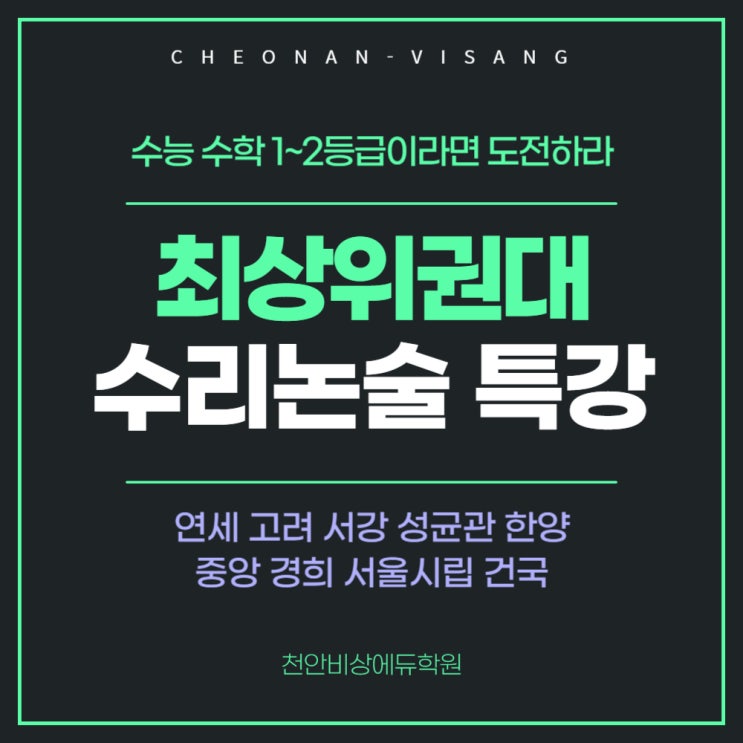 최상위 수리논술로 연고서성한에 더 가까이 최상위권 대학의 꿈, 천안비상에서 현실로 이룰 수 있습니다. 중부권 논술 명문 천안비상 논술팀에서 2027학년도 최상위권 대학 수리논술반을 개설했습니다. 개강은 5월 10일입니다. 개강일: 2026년 5월 10일 (일) 오후 5시 소수 정예 집중 수업 수업 회차: 총 24화 수업 구성: 주제심화강의 + 대표문제풀이 + 1:1 첨삭 대상 대학: 연세대 고려대 서강대 성균관대 한양대 경희대 서울시립대 건국대 수리논술은 단순히 수학 문제를 푸는 시험이 아닙니다. 채점관이 읽는 것은 '답'이 아니라 '논리의 흐름'입니다. 아무리 정답을 알아도 서술이 불완전하면....... <img src="https://blogthumb.pstatic.net/MjAyNjA0MTdfMjU4/MDAxNzc2NDA4NDQ1Mjk5.5EK46pMcZTm-nL86wazKBMcyklvlT_OWpqoqJQ7Rimgg.InPXmCTb_z3Z4KTFlI5Q5voxbx8hFJPrToxgj0iNvNog.JPEG/%C3%B5%BE%C8%BC%F6%B8%AE%B3%ED%BC%FA%C7%D0%BF%F8%C3%D6%BB%F3%C0%A7%B1%C7%B4%EB%C7%D0%C3%B5%BE%C8%BA%F1%BB%F32027%BD%E6%B3%D7%C0%CF.jpg?type=s3" />