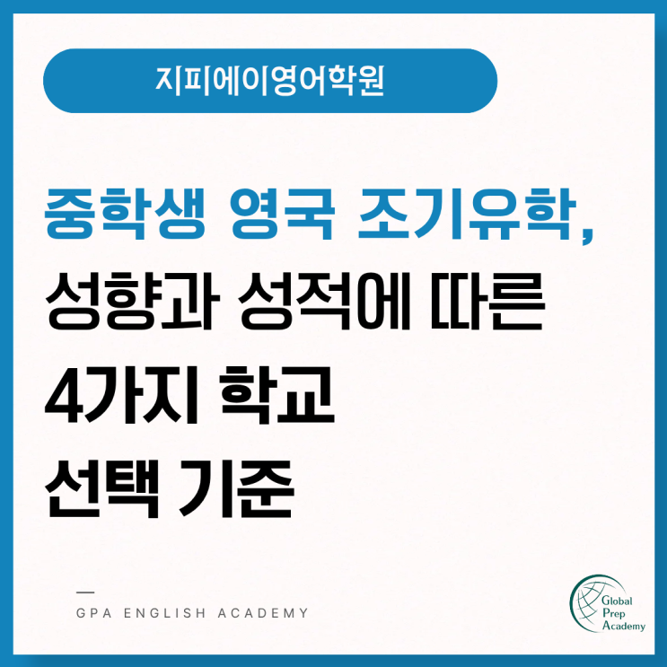 중학생 영국 조기유학 학교 선택 시 고려해야 할 4가지 기준 안녕하세요. 11년째 국내외 입시지도를 하고 있는 지피에이영어학원 원장 정승주입니다. 이 글을 읽고 계시다면 아마 중학생 자녀의 영국 조기유학 때문에 고민 중이신 분들일 거라 생각합니다. 좋은 학교가 어디인가요? 무조건 유명한 학교에 가야 아이에게 도움이 되는 건가요? 실제로 제가 학원에서 상담 중에 가장 많이 듣는 질문 2가지입니다. 무조건 좋은 학교를 가야 할까요?라는 질문에 저는 항상 그렇지 않다고 말씀드려요. 자녀의 성격을 제대로 고려하지 않은 채 학교를 선택했을 때, 유감스럽게도, 불과 한 달 후에 다시 돌아오는 경우도 적지 않기 때문입니다. 그래서 이....... <img src="https://blogthumb.pstatic.net/MjAyNjAyMTZfMjUw/MDAxNzcxMjAxMzY2MTc5.rUe99Hjt6RVjUKAmiW0O60dhZCwc_0bjRC4_SJ9O93Qg.tACDSiVpiNeiVt0zCp5keTICXrZwDSvroPuI8WeNWX4g.PNG/1.png?type=s3" />