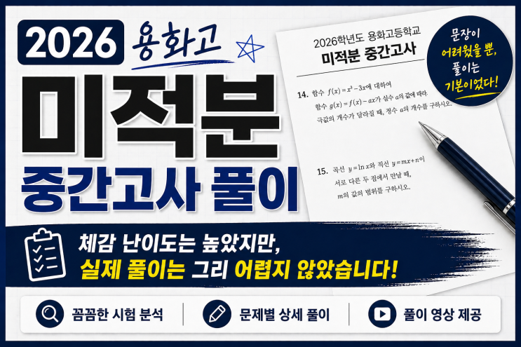 용화고 미적분 중간고사 분석 이번 시험은 전반적인 풀이 난이도는 높지 않았습니다. 기본 개념과 교과서 수준의 접근만으로도 충분히 해결 가능한 문제들이었습니다. 다만, 문제의 문장과 조건 제시 방식이 다소 까다롭게 구성되어 문제를 해석하는 과정에서 어려움을 느낀 학생들이 많았을 것으로 보입니다. 시험장에서의 체감 난이도는 상당히 높았을 것으로 예상 특히 조건을 정확히 읽지 못하거나, 의도를 빠르게 파악하지 못한 경우 시간 소모가 커졌을 가능성이 있습니다. 또한 이번 시험에서는 서답형 문항이 객관식보다 상대적으로 더 수월하게 출제된 점도 특징적입니다. 풀이 과정을 차근차근 전개하면 충분히 해결 가능한 구조였기 때....... <img src="https://blogthumb.pstatic.net/MjAyNjA0MjZfMzEg/MDAxNzc3MTg4NjQzMDk4.eJvlVbeOPyImPAEeBPINbadIiYrN0SnPZ9ycHBsC0LEg.BgSZAcDBrh7osCE-N5T2spC7y4ep_6PzkHsfFu2M-dsg.PNG/%BF%EB%C8%AD%B0%ED_%B9%CC%C0%FB%BA%D0_%BD%E6%B3%D7%C0%CF.png?type=s3" />