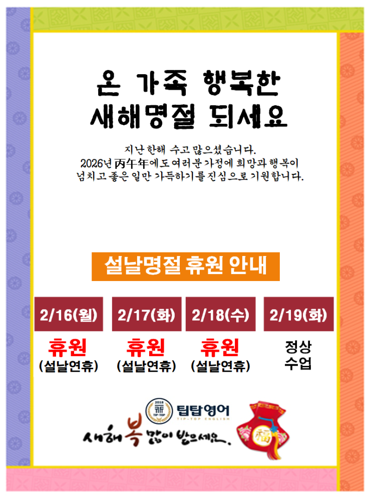 [은평구 진관동 팁탑영어학원]설날 휴원 안내