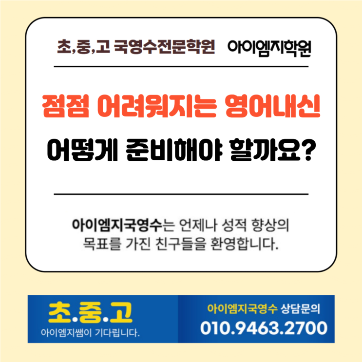 겨울의 끝자락에서 새 학기를 준비하시는 학부모님 여러분, 안녕하세요. 아이엠지학원입니다. 2025학년도 2학기에 생애 첫 영어 내신시험을 치렀던 중1 학생들이 이제 중2가 되어 1학기부터 본격적인 내신 경쟁 속으로 들어갑니다. 시험이라는 개념 자체가 낯설었던 초등학생이 중학생이 되어 치른 첫 내신, 그 성적표를 받아보셨을 때 어떤 생각이 드셨나요? 2026학년도에는 더욱 까다로워진 영어 평가 방식이 적용되는데, 지금 준비는 충분히 되어가고 계신가요? <아이엠지학원 오시는 길> 중1 내신부터 어려움을 겪고 있다면 서둘러 중2 영어 내신 준비에 착수해야 합니다. 저희 아이엠지학원에서 지켜본 바로는, 기본기가 탄탄하지 못....... <img src="https://blogthumb.pstatic.net/MjAyNjAyMTZfNDgg/MDAxNzcxMjA3MzMxMjQw.LmgDbhQPoefc8TXgNaBsCkBPLOPV6-wyojTNCU59btwg.KxdqiSJJJ9aDcyhHqsNOuwgY2pERHz1JaQCULrL9X2cg.PNG/%BE%C6%C0%CC%BF%A5%C1%F6%C7%D0%BF%F8_%281%29.png?type=s3" />