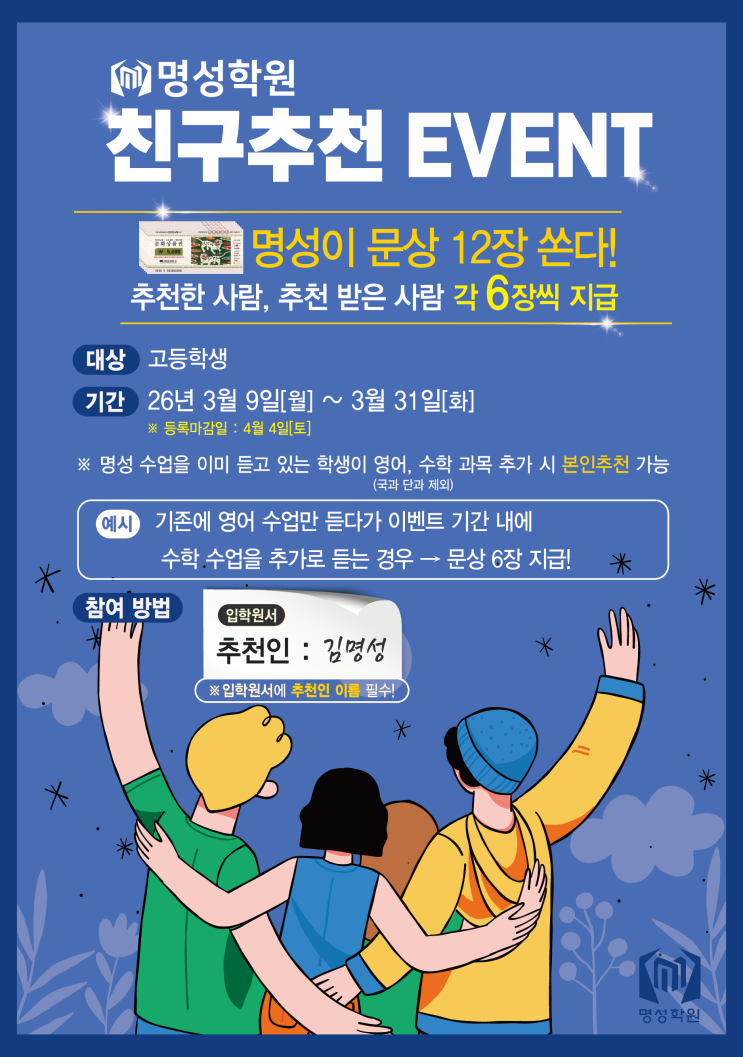 § 고등 친구추천 이벤트를 진행합니다! 친구와 함께 명성에서 공부하고 성적과 혜택을 동시에 잡으세요. 신입생을 추천한 재원생에게 문화상품권 6장 증정 ! 추천으로 등록한 신입생에게도 문화상품권 6장 증정 ! 재원생이 영어, 수학 중 수강하지 않는 과목 추가 시 문화상품권 6장 증정(본인추천가능) § 이벤트 기간 -기간: 3월 9일(월) ~ 3월 31일(화) -등록 마감일: 4월 4일(토) § 명성학원 고등부의 독보적인 경쟁력 ● 고등 영어 시스템 - 학교별 출제 경향을 완벽 분석한 명성만의 자체 제작 내신 교재 사용 - 구문과 문법의 원리 이해를 통한 독해력 향상 및 서술형 문제 완벽 대비 - 어휘 및 듣기 집중 관리 클리닉과 수업 영상 온라인....... <img src="https://blogthumb.pstatic.net/MjAyNjAzMDlfMTA0/MDAxNzczMDM1Mjc5NDY3.Cxj_TLVbS3vUdrkr828WDP9D76hr51IbFVKYihuW9r4g.5YZ8mQz6E9yM1EzhgakvQVl5ea8Udy32AdUbFPErwzog.PNG/%B0%ED%B5%EE_%C4%A3%B1%B8%C3%DF%C3%B5_%C0%CC%BA%A5%C6%AE_%C6%F7%BD%BA%C5%CD_26.3.6.png?type=s3" />