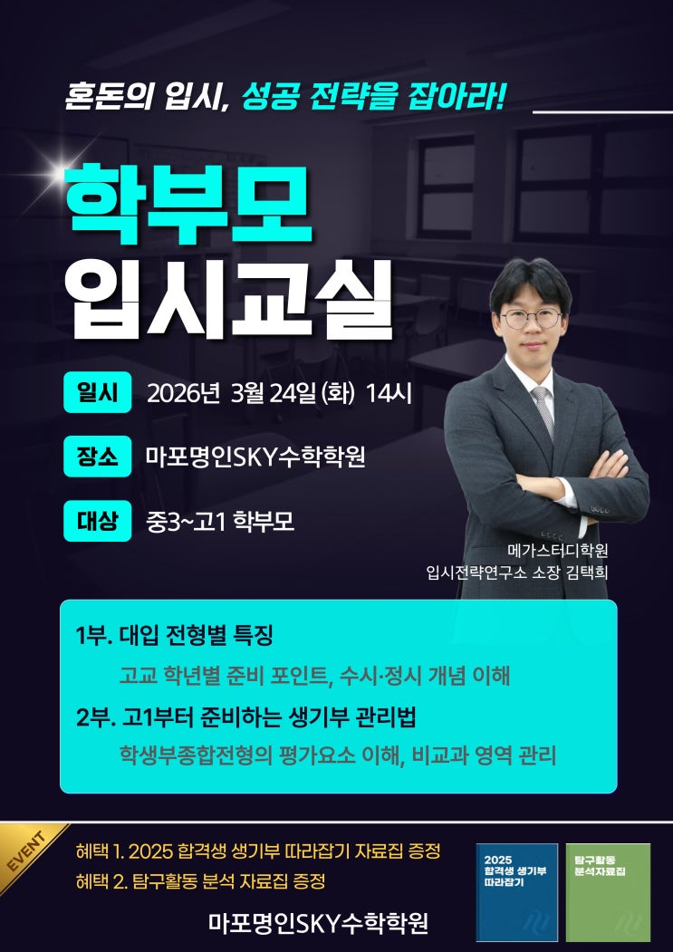 고등 1학년 학부모님 대상으로 대학입시설명회를 진행합니다. 0. 일시 - 3월 24일(화) 오후 2시 0. 주제 1부 - 대입전형별 특징 2부 - 고1 부터 준비하는 생기부 관리법 0. 강연자 - 메가스터디 입시연구소 김택희소장 0. 참석자 특전 - 2025 합격생 생기부 따라잡기, 탐구활동 분석 자료집 제공 추가) 윈터스쿨 참석 학생은 사전 예약시 김택희소장님과 1:1 컨설팅 가능 0. 참석 예약 - 전화)02 6381 0909 (문자)010 8540 0959 <img src="https://blogthumb.pstatic.net/MjAyNjAzMDVfMjQ4/MDAxNzcyNzAwODkwMzYx.MEx57y2e9iUpJzBg2GMUHsVUIrKvvkUc3b0jEB0jr4Yg.-Shz-iAzjK8L5B_0njCZ1Xlv0_GzUKita2fzyVo2c0Eg.JPEG/26%B3%E2_3%BF%F924%C0%CF_%B0%ED1_%BC%B3%B8%ED%C8%B8.jpg?type=s3" />