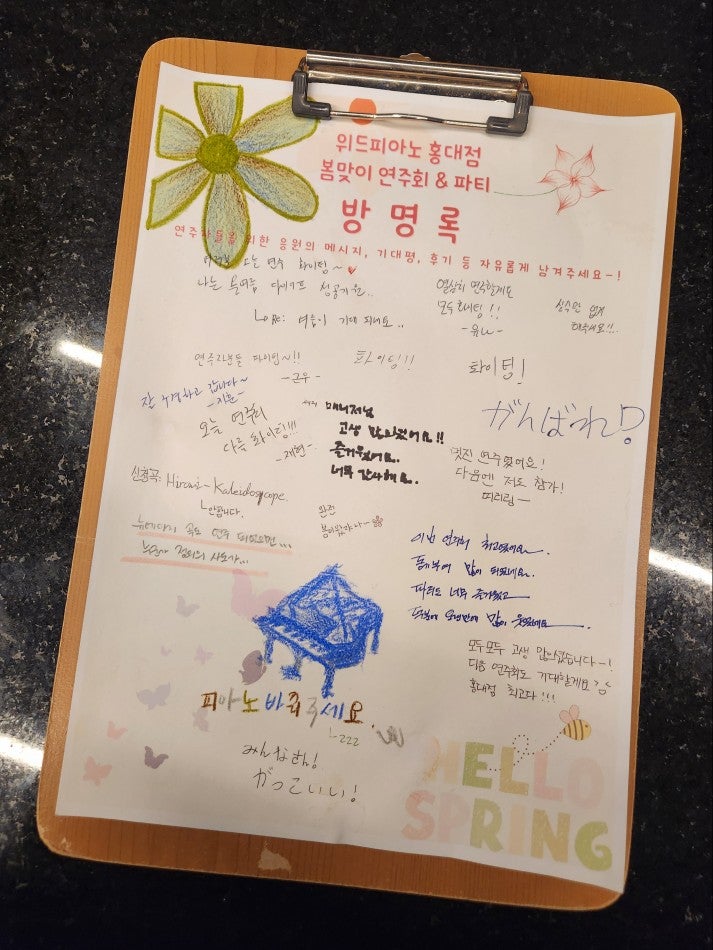 안녕하세요~ #홍대성인피아노학원 위피홍대점 매니저입니다-! 여러분~ 저희 지난주에 봄맞이 연주회 했어요! 수강생분들의 멋진 연주도 듣고 맛있는 음식도 먹고 재미난 게임도 하고! 정말 정말 즐거운 시간이었는데 말이죠! 즐거웠던 봄맞이 연주회 현장! 지금부터 하나하나 소개해 드리겠습니다! 짠! 봄맞이 파티를 위해 풍선도 열심히 불어서 붙였는데요! 봄맞이 파티답게 꽃으로도 꾸며보았는데 너무 예쁘지 않나요?!✨ 이 모든 것들은 홍대점 담당 디자이너 찬우쌤의 손길이 닿은 것들이랍니다 분주한 매니저를 대신해 열심히 학원을 꾸며주신 찬우쌤께 감사를...! 자 연주회가 시작되었는데요! 이번에 포핸즈부터 클래식, 가요....... <img src="https://blogthumb.pstatic.net/MjAyNjAzMTNfMjA3/MDAxNzczMzg4NjczOTQ1.oZJ5JiFXn6BIcsBMk652IdyMOi97njWPIfm0PN3Wp_kg.0gtEzcixo9GJikqbSBLe2_ZW5GjKLvKFatjPB1gx0FMg.JPEG/KakaoTalk_20260313_165134275.jpg?type=s3" />