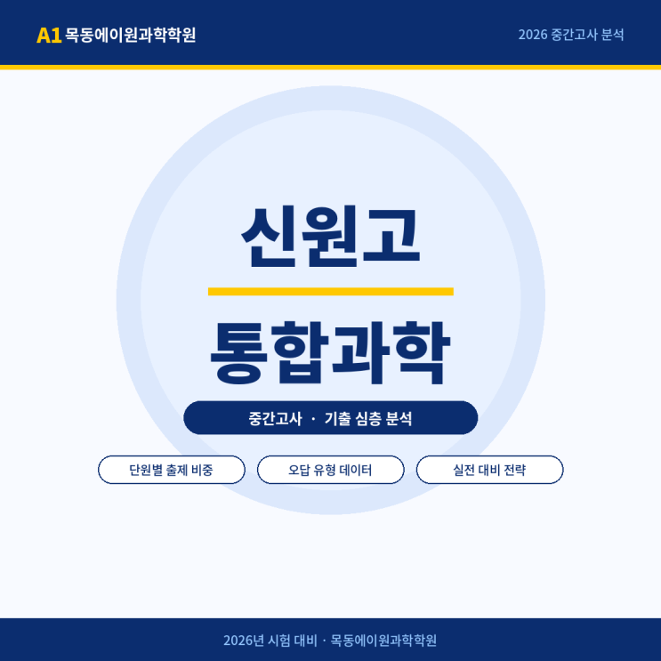 안녕하세요. 목동에이원과학학원 입니다. 2026학년도 1학기 중간고사가 마무리되었습니다. 시험이 끝난 후 가장 먼저 해야 할 일은 점수 확인보다 출제 경향 분석입니다. 어디서 얼마나 나왔고, 왜 틀렸는지를 정확히 파악해야 기말고사 준비가 달라지기 때문입니다. 오늘은 신원고 1학년 통합과학 중간고사를 분석한 내용을 공유합니다. 시험 기본 구성 이번 신원고 1학년 통합과학 중간고사는 선택형 30문항으로 구성되었습니다. 서답형은 없었고, 전체 난이도는 중간 수준으로 평가됩니다. 소위 킬러 문항, 즉 최상 난이도 문항은 단 한 개도 출제되지 않았습니다. 이 말의 의미는 중요합니다. 이번 시험은 실력자와 일반 학생을 극단적으로 가....... <img src="https://blogthumb.pstatic.net/MjAyNjA0MjlfMjk4/MDAxNzc3NDU3MjU2MDc1.y25a0tfpwkYjIswgcrOxLfrz-bnGJw3tsiA9GU54LHUg.qTKAy3TYmgiSMRg6Cs_RhBFMFCkXhogW4RK3SXcGA2kg.PNG/%BF%A1%C0%CC%BF%F8%C4%AB%B5%E5%B4%BA%BD%BA_01_%C7%A5%C1%F6.png?type=s3" />