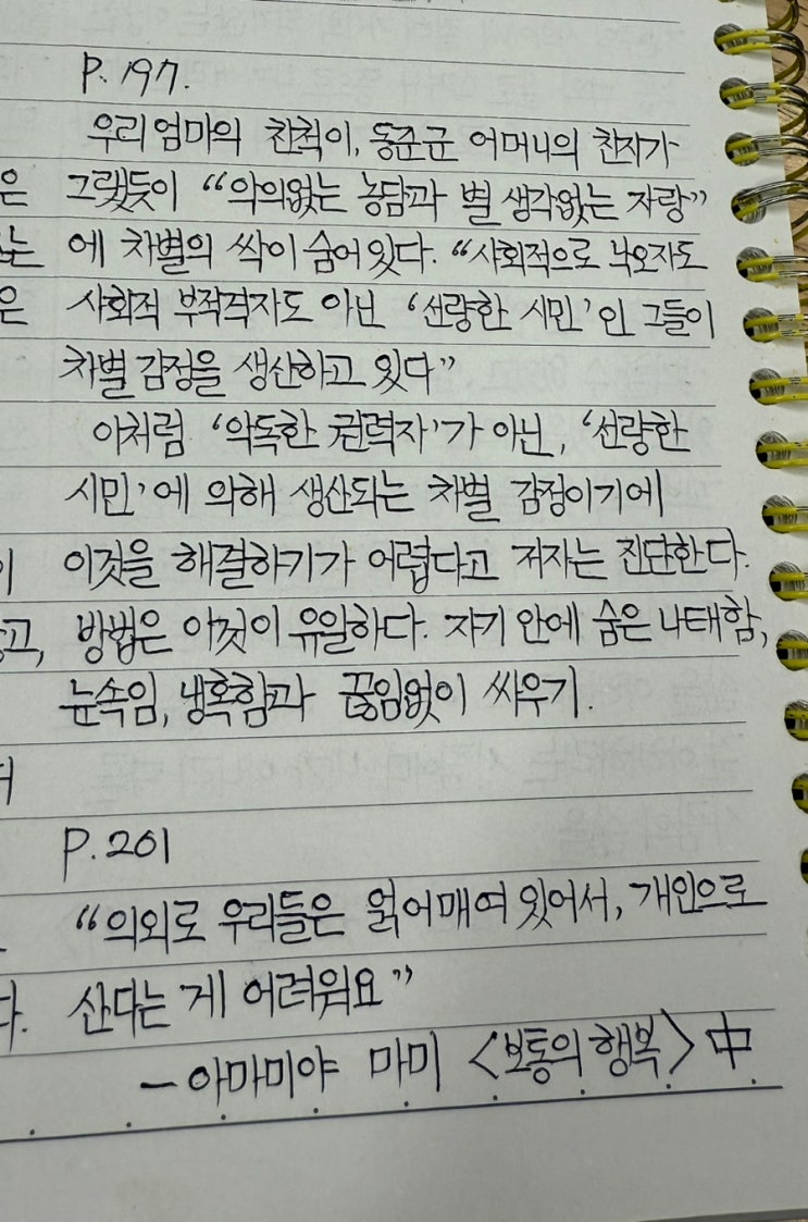 2년 전쯤 읽었던 은유 작가의 <다가오는 말들>엔 유독 오래 기억하고 싶은 구절들이 많았다. 휘갈기듯 메모장에 옮겨 적어 놨던 것들을 요즘 필사 노트에 다시 정리하고 있는 중이다. 생각해보면 얼굴을 마주하고 있는 만남에서 웃으며 화기애애하게 나눈 대화들에서도 미세하게 마음을 다쳤던 순간들이 있었던 것 같다. 그게 바로 글에 나와 있는 차별 의식 때문이 아니었던가 싶다. 상대는 너무나 가벼운 농담처럼 던진 말들이라 거기에 뭐라고 대꾸도 할 수 없었던, 오히려 반응을 하면 나만 예민하고 이상한 사람이 되는 그런 분위기. 평소엔 따뜻하고 유쾌한 사람이라고 생각했던 이들의 말이라 더 마음이 안 좋았던 건지도 모르겠다....... <img src="https://blogthumb.pstatic.net/MjAyNjAyMTFfMjI0/MDAxNzcwNzY3MDAzMzM0.XKF-Q5JHQ-asmL8KxQfMe5SgikUfJcKxGFvvpK-HJ5Eg.Vl1gBlAn4zq88kmT0-9wuQaVtoJoqblbbciaHx3AtWEg.JPEG/IMG%A3%DF5674.jpg?type=s3" />