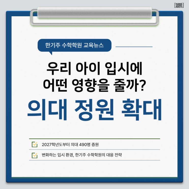 안녕하세요~ 언제나 정성을 다하는 30년 수학교육 전문 한기주 수학학원입니다! 정부가 2027학년도부터 의과대학 정원을 단계적으로 확대하기로 발표했습니다. 의대 입시는 매년 변화의 중심에 있었지만, 이번 발표는 중장기적인 구조 변화라는 점에서 주목할 필요가 있습니다. 오늘은 학부모님들께서 꼭 알아두셔야 할 핵심 내용을 정리해드립니다. 1.의대 정원, 얼마나 늘어나는 걸까? 현재(2024학년도 기준) 전국 의대 정원은 3,058명입니다. 이번 발표에 따르면 정원은 다음과 같이 늘어납니다. ·2027학년도 → 490명 증가 (총 3,548명) ·2028~2029학년도 → 613명 증가 (총 3,671명) ·2030학년도 이후 → 813명 증가 (총 3,871명) 향후 5년....... <img src="https://blogthumb.pstatic.net/MjAyNjAyMTFfNTQg/MDAxNzcwNzgxMzc1NDk1._cTsVeyQkbT_OcJHmXtUaAfeeEZ7EYRTce6jZ5wEQkMg.wsEMsdkkLP8TGbPVljz64A2Iw9c-gP5wyyMWvwHth6wg.JPEG/001.jpg?type=s3" />