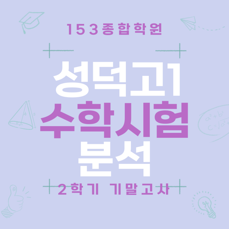 1등급의 문턱이 낮아졌다? 성덕고 수학 기말고사 분석 및 실수 제로 2학년 전략 안녕하세요, 학생의 잠재력을 성적으로 증명하는 153종합학원입니다. 이번 **성덕고1 2학기 기말고사 수학** 시험을 치른 우리 학생들과 지켜보신 학부모님들, 고생 많으셨습니다. 성덕고 시험은 타 학교와는 확실히 다른 결을 가지고 있습니다. "나만 어려운 게 아니었을까?"라는 불안감보다는 "어떻게 하면 실수를 줄이고 변별력 문항을 잡아낼까?"라는 전략적 접근이 훨씬 중요한 학교입니다. 저희 153종합학원에서 분석한 이번 **성덕고 수학** 기말고사 데이터를 통해, 누구나 도전할 수 있는 1등급의 길을 제시해 드립니다. 1. 시험....... <img src="https://blogthumb.pstatic.net/MjAyNTEyMThfMTkx/MDAxNzY2MDQ2NjMzNDc2.K6_n6vH-04JRoG_LmCiFhPnEmKlByoovhGj8UrBDOOAg.rVcOdYiwXf8jyaP7J-YnbarHSAfg3HwAzza90m3bb3cg.PNG/001.png?type=s3" />